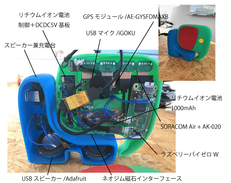 mimieは主にマイクとスピーカー、ラズベリーパイ、SORACOMから構成されており、困っているかどうかの感情認識はempath APIを利用しています。