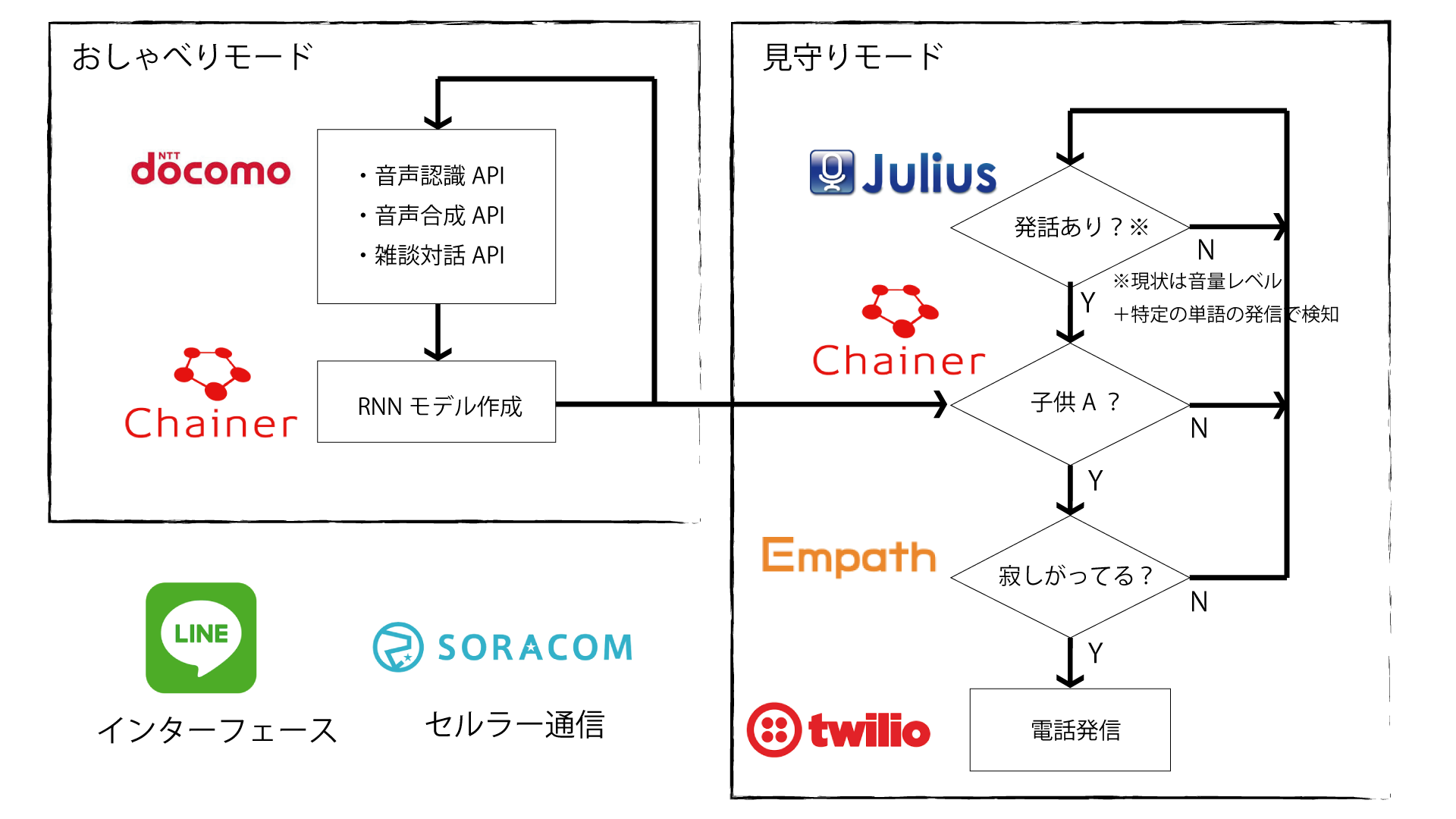 そのために、楽しくおしゃべりしながら子供の声を取得できるように、docomoの雑談対話APIや音声合成APIを利用しています。