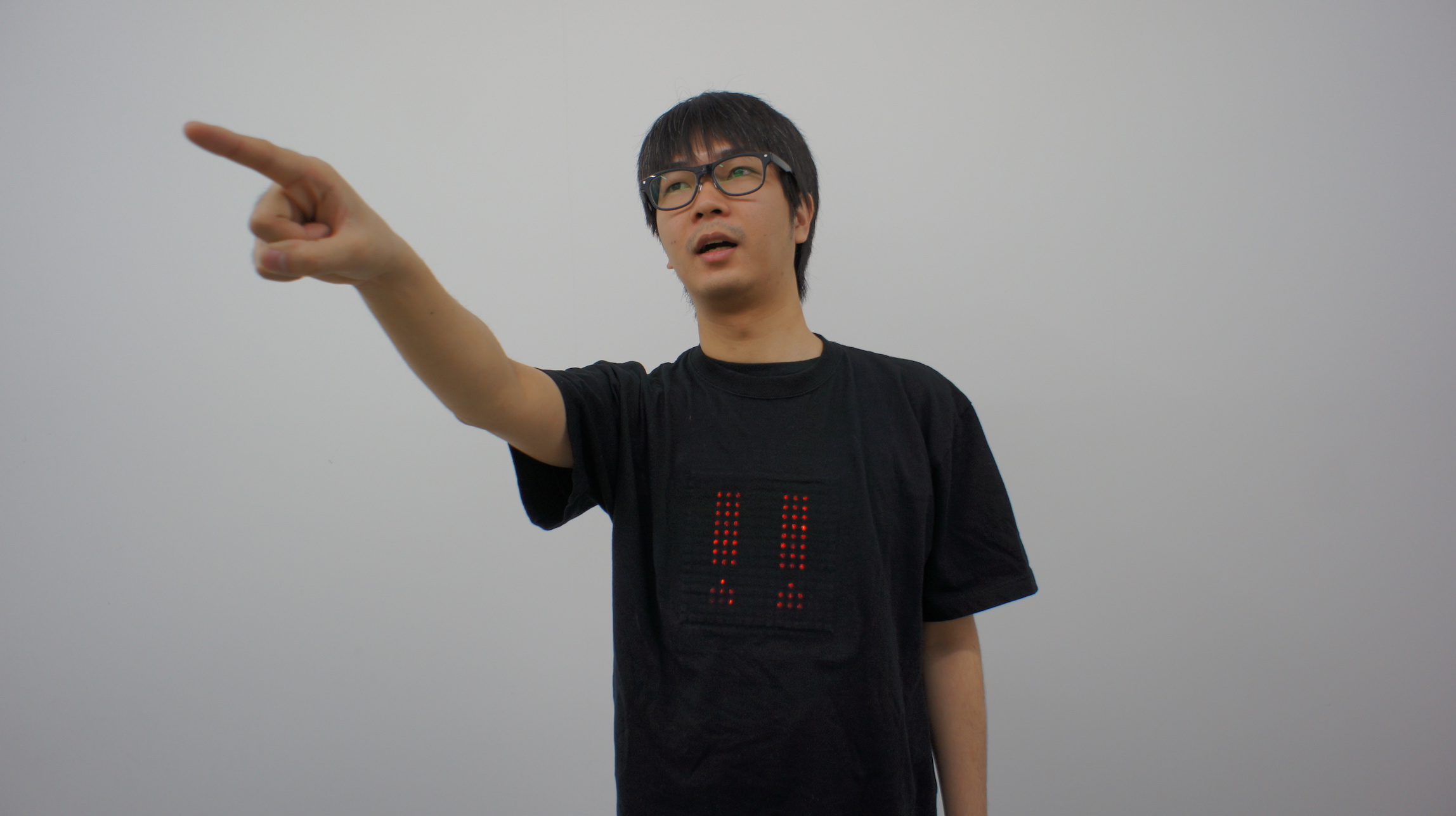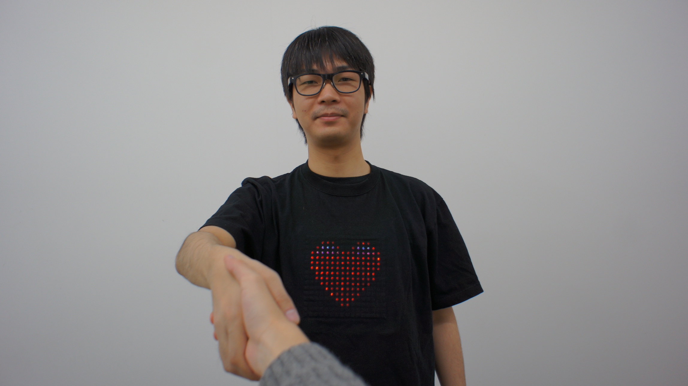 普段はコンピュータ・サイエンスを専攻している学生です。遠隔地同士のコミュニケーションの研究を行っています。今回の作品はコミュ障な自分のためのTシャツです。