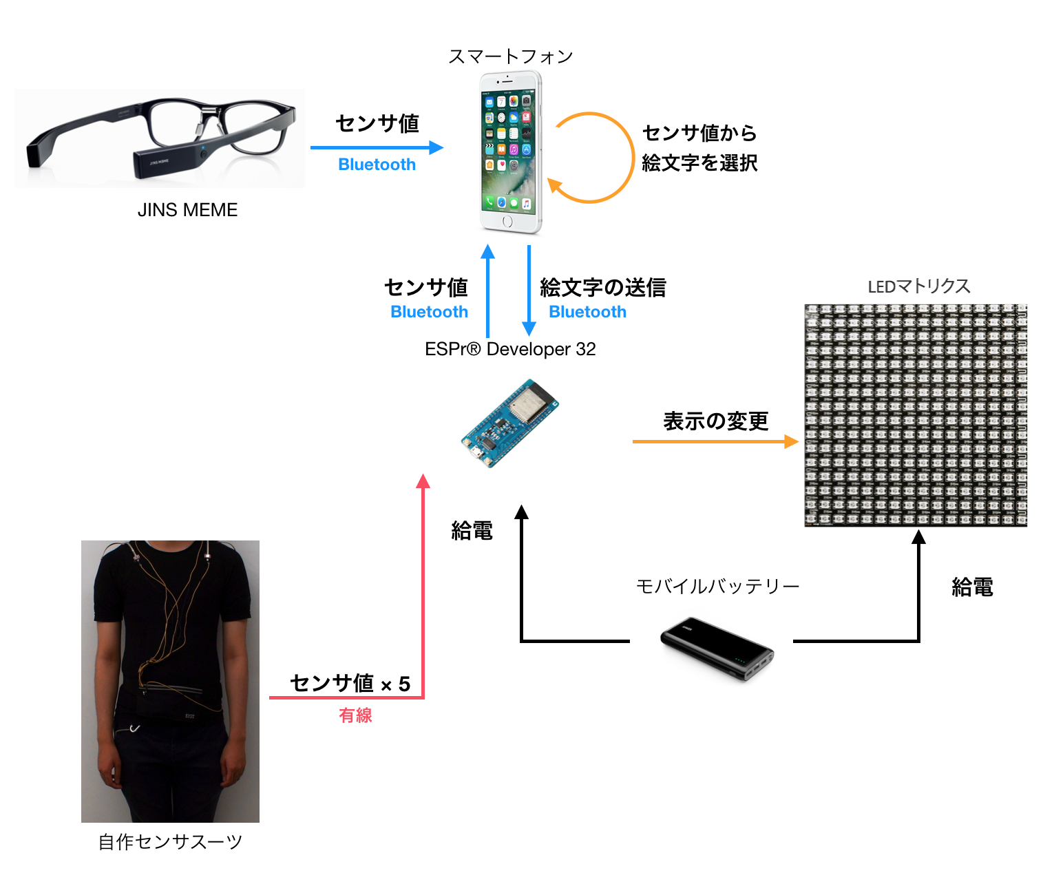 ユーザは胸元にLEDディスプレイ・曲げセンサが埋め込まれたTシャツとメガネ型ウェアラブルデバイスを装着します。メガネ型ウェアラブルデバイスは、眼球の動きや瞬きをセンシングすることができます。EmoTは、曲げセンサによって ポーズを、メガネ型ウェアラブルデバイスによって目の動きをセンシングすることで装着者の感情を推定し、推定された感情に関連する絵文字をTシャツ上のLEDディスプレイに表示します。
