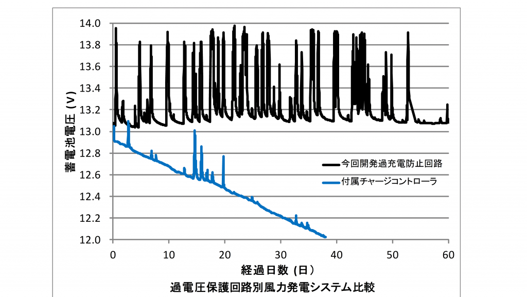 グラフは、太陽光発電ではなく風力発電の場合で過充電防止回路のみ搭載した場合の実験結果ですが、市販チャージコントローラの場合と異なり、60日経過後も満充電を維持していることがわかります。本技術は、太陽光発電、風力発電に対し用いることができ、おそらく水力発電にも用いることができるはずです。