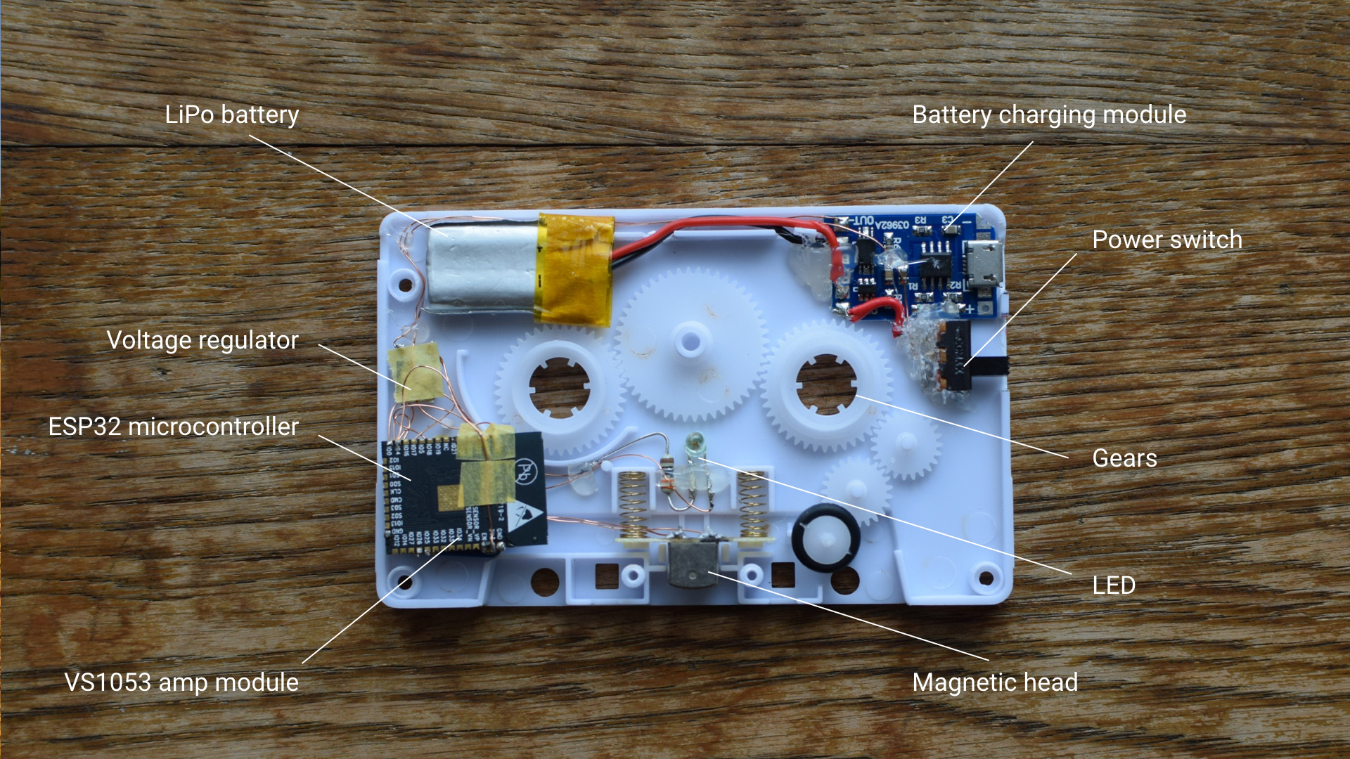 カセットの中にはWiFi対応のマイコンが入っており、インターネットのストリーミング音楽を磁気ヘッドからアナログで出力します。