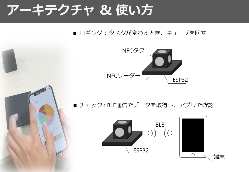 Cube内のRFIDタグとStation内のリーダーでステータスを取得、記録されたデータはBLEで上位端末(PC,スマホ等)へ送信可能です。Cubeの操作は日常的に行いますが、上位端末へのデータ送信は週に1回程度で問題ありません。