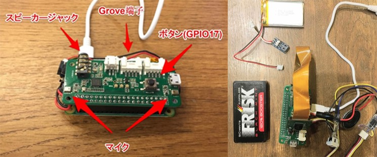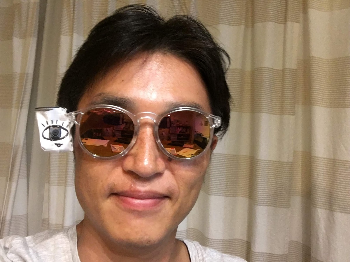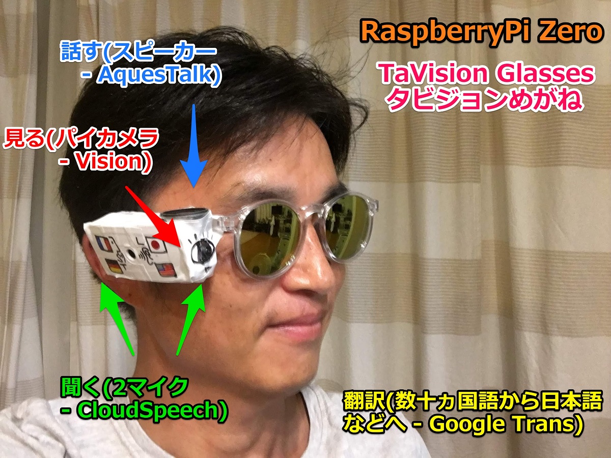 RaspberryPi Zeroにカメラ、マイク、スピーカー、ボタンが一体となったデバイスが眼鏡の横に付いています。そこのボタンを押すか、声の指示で: