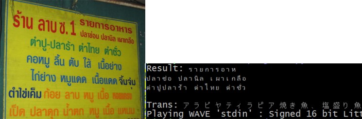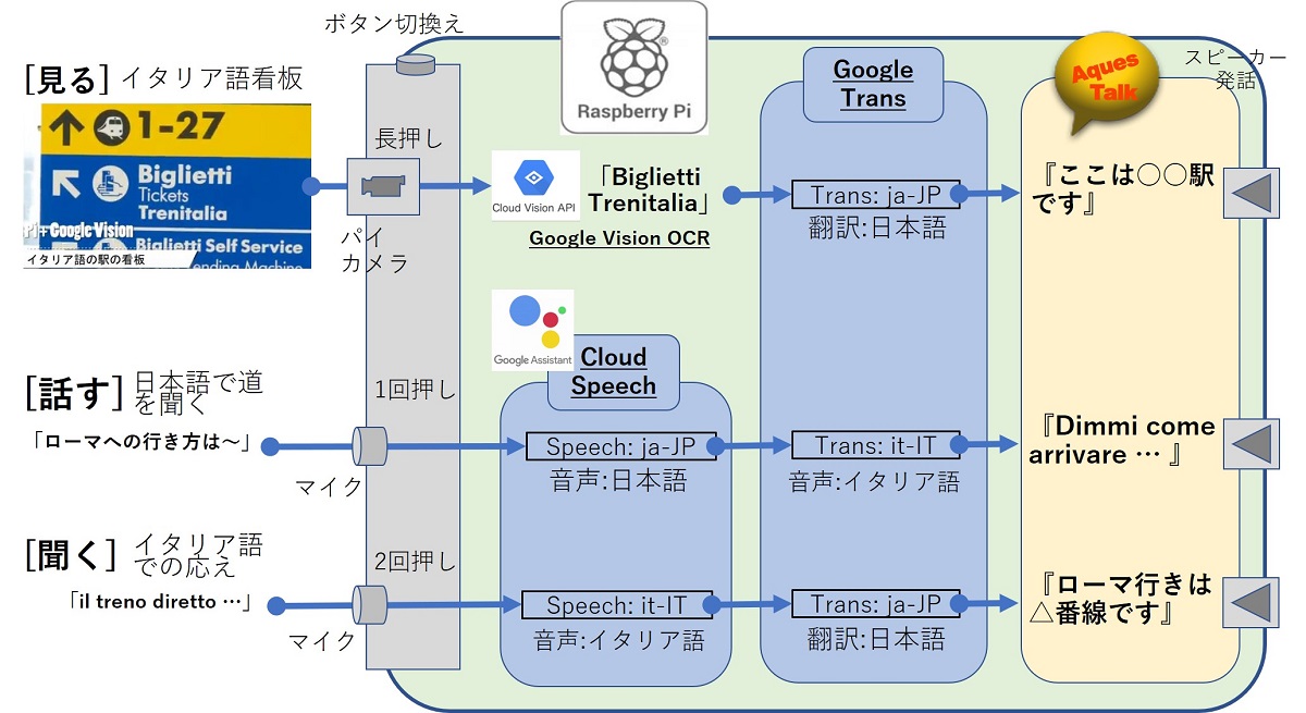 - 翻訳設定: ラズパイ上のPythonプログラムのパラメータを、--speech it-IT (聞取り言語) --trans ja-JP (翻訳先言語)の様に設定しています。言葉の聞き取りには、GoogleのAPIのGoogle Cloud Speechを使い、翻訳にはGoogle Translateを使っています。画像読み取りには、Google Vision APIを使い、読み上げには音声合成のAquesTalkを使っています。