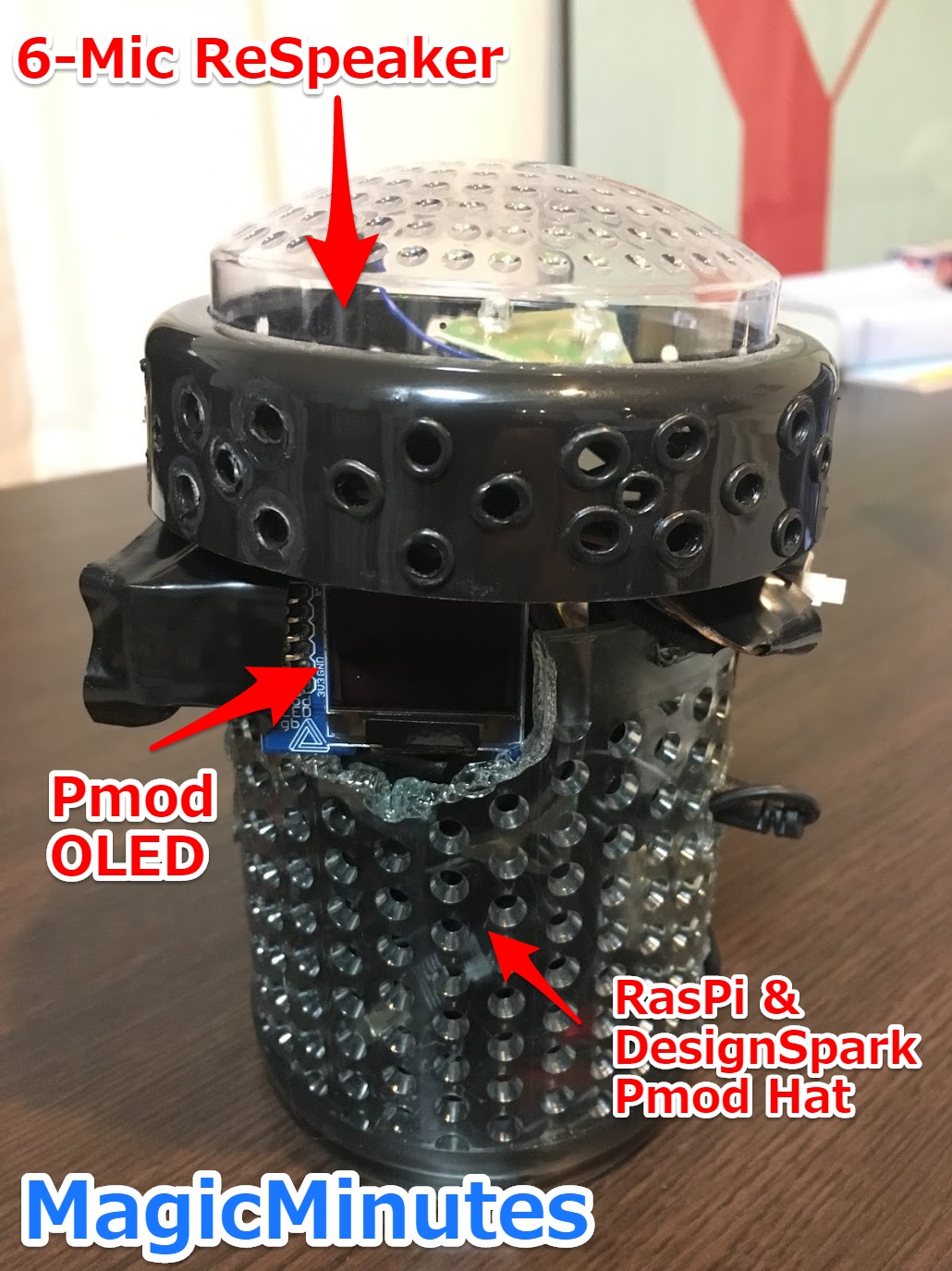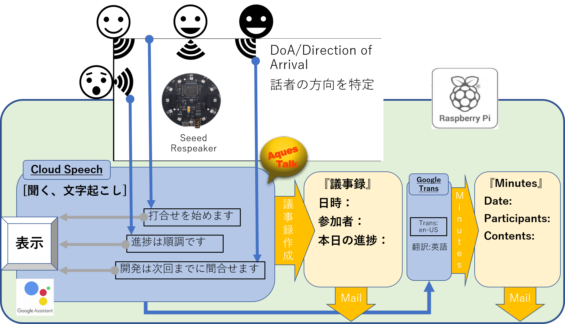 最大の特徴は、6つのマイクが付いたラズパイ用ReSpeakerを使って、最大6方向からの位置を特定し、それぞれの座った人の場所毎の会話を、議事録として残せる事です。