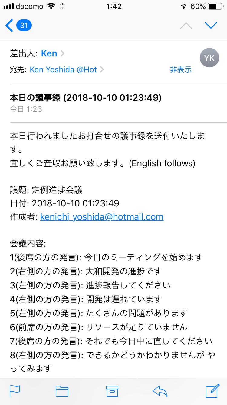 リアルタイムで日本語から英語の議事録を話者の位置(Front, Backなど)も含め作成してくれています。