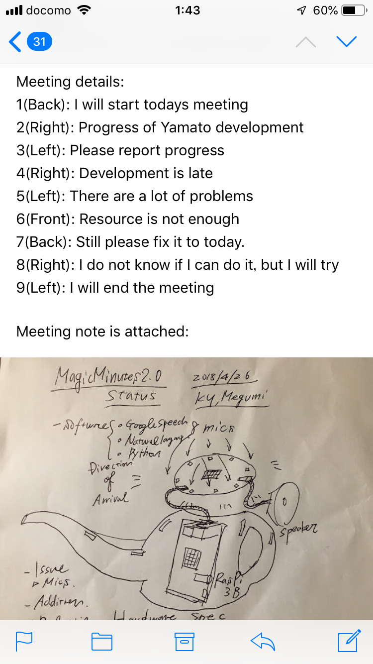 最後に「終了です」などのバイバイワードを話すと、会話を止め、リングが光り出し、取得した発話履歴から議事録を作り出します。どの席の位置の人が喋ったか(前方、後方、右側など)も分かるので、より内容を理解するのに役立ちます。