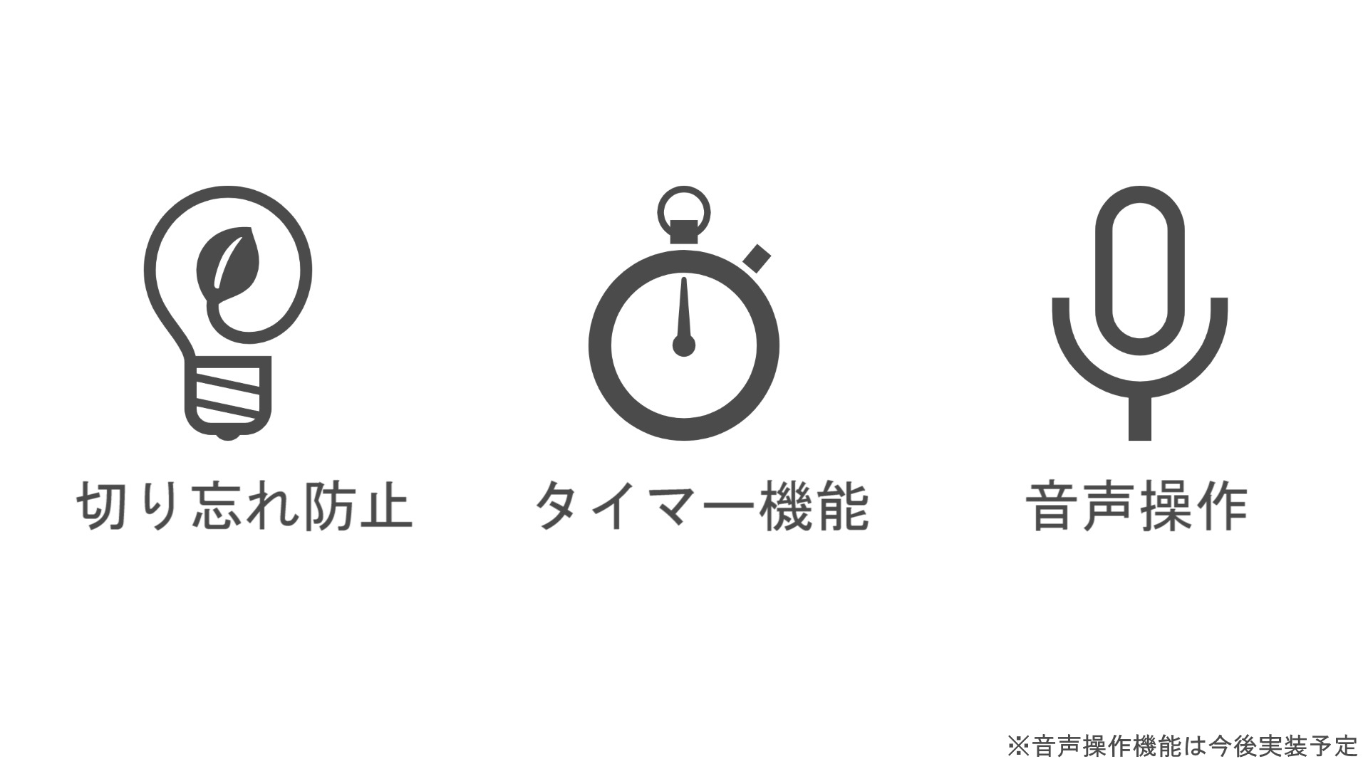 更に、切り忘れの防止機能やタイマー機能も搭載しており、切り忘れによる火災を未然に防いだり、暖房機器にタイマー機能を追加することもできます。また、将来的にはスマートスピーカによる音声操作も実装予定です。