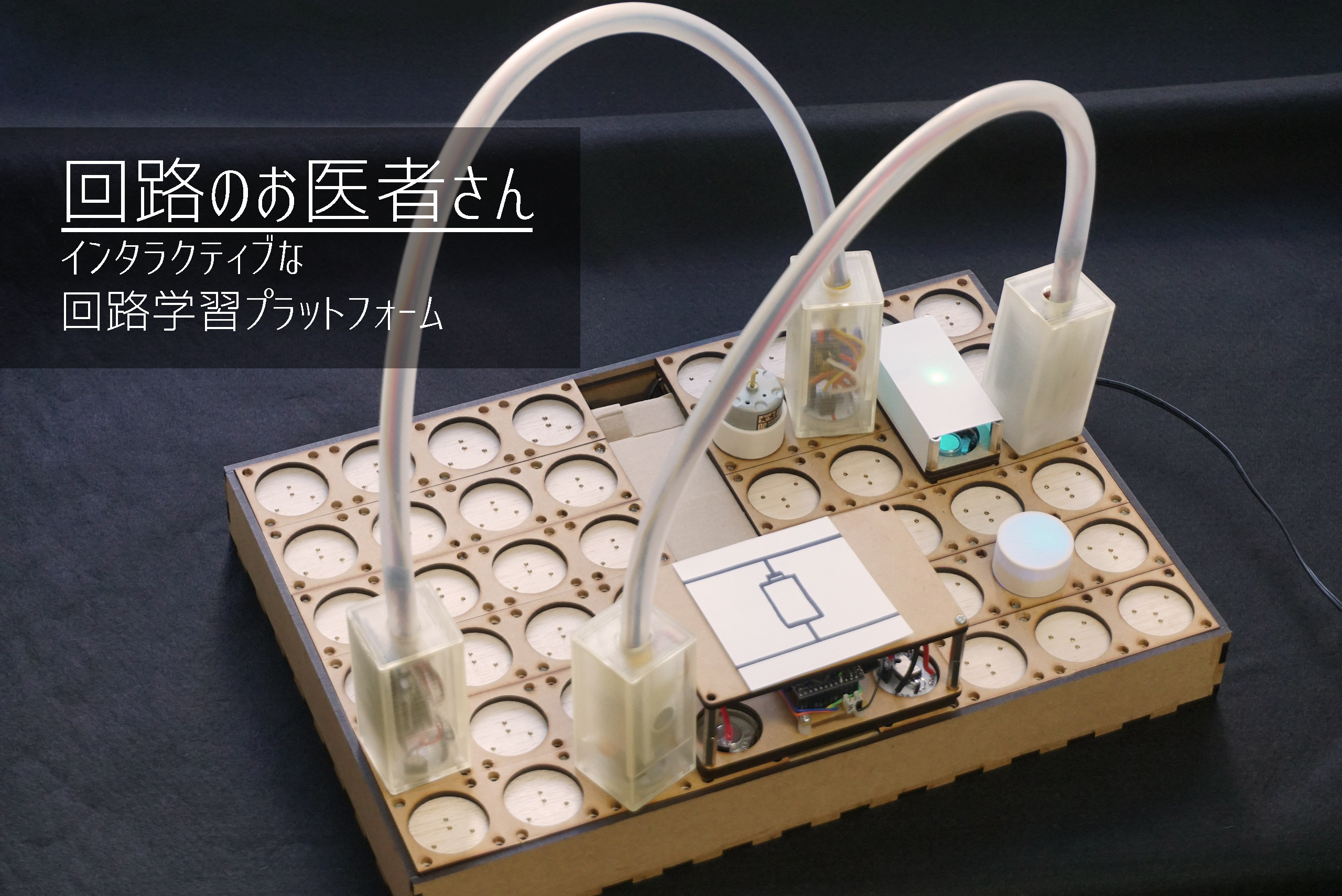 「回路のお医者さん」は,電気やその働きを直感的に感じたり操作できたりといったインタラクティブ要素を盛り込んだ,電気回路の学習支援システムです.実際の電子工作ではよく行う「ブレッドボードやジャンパワイヤで回路を作る」という作業をメタファーし,加えて「配線を握って電流を流しにくくする」といった直感的な操作が行える特別な装置を導入します.回路にふれる体験を豊かなものにすることで,回路に対する興味を深めてもらったり,今後の勉強の足がかりにしてもらったりということを狙っています.