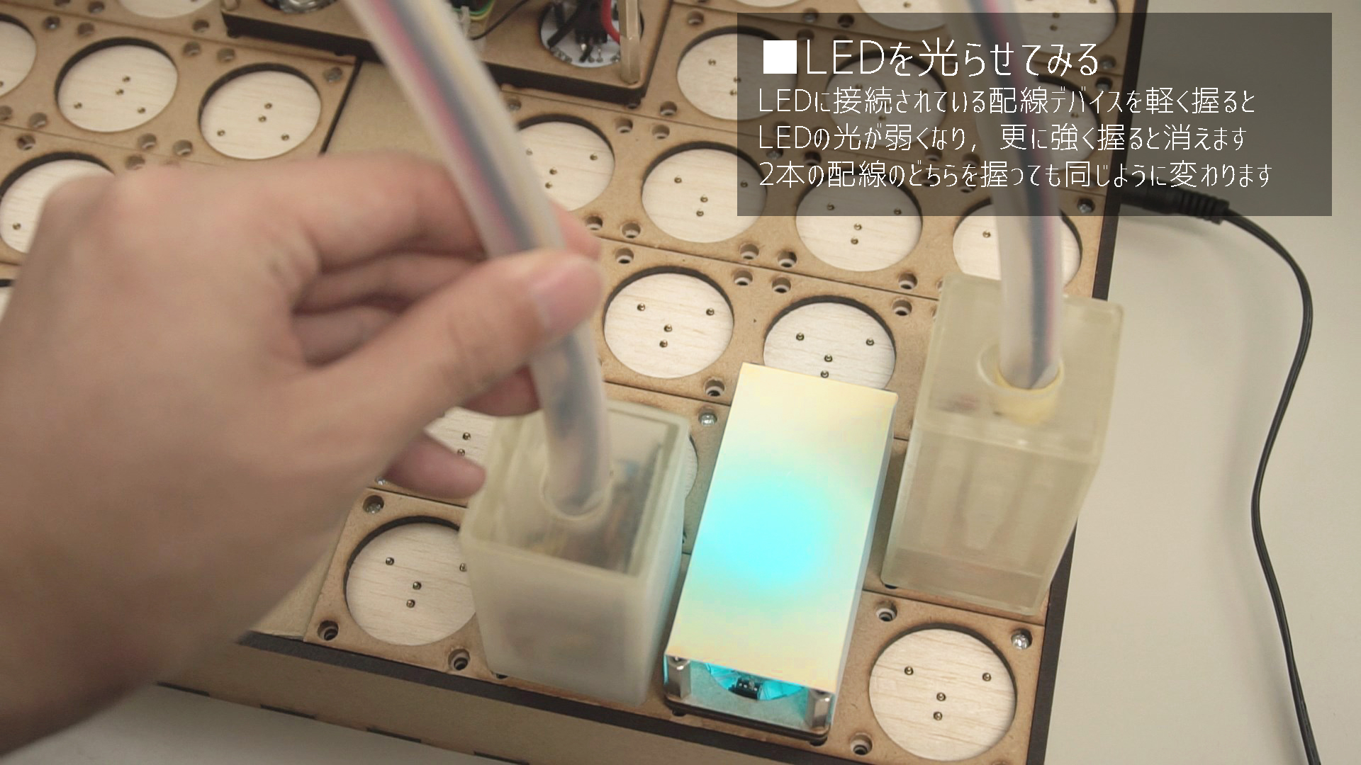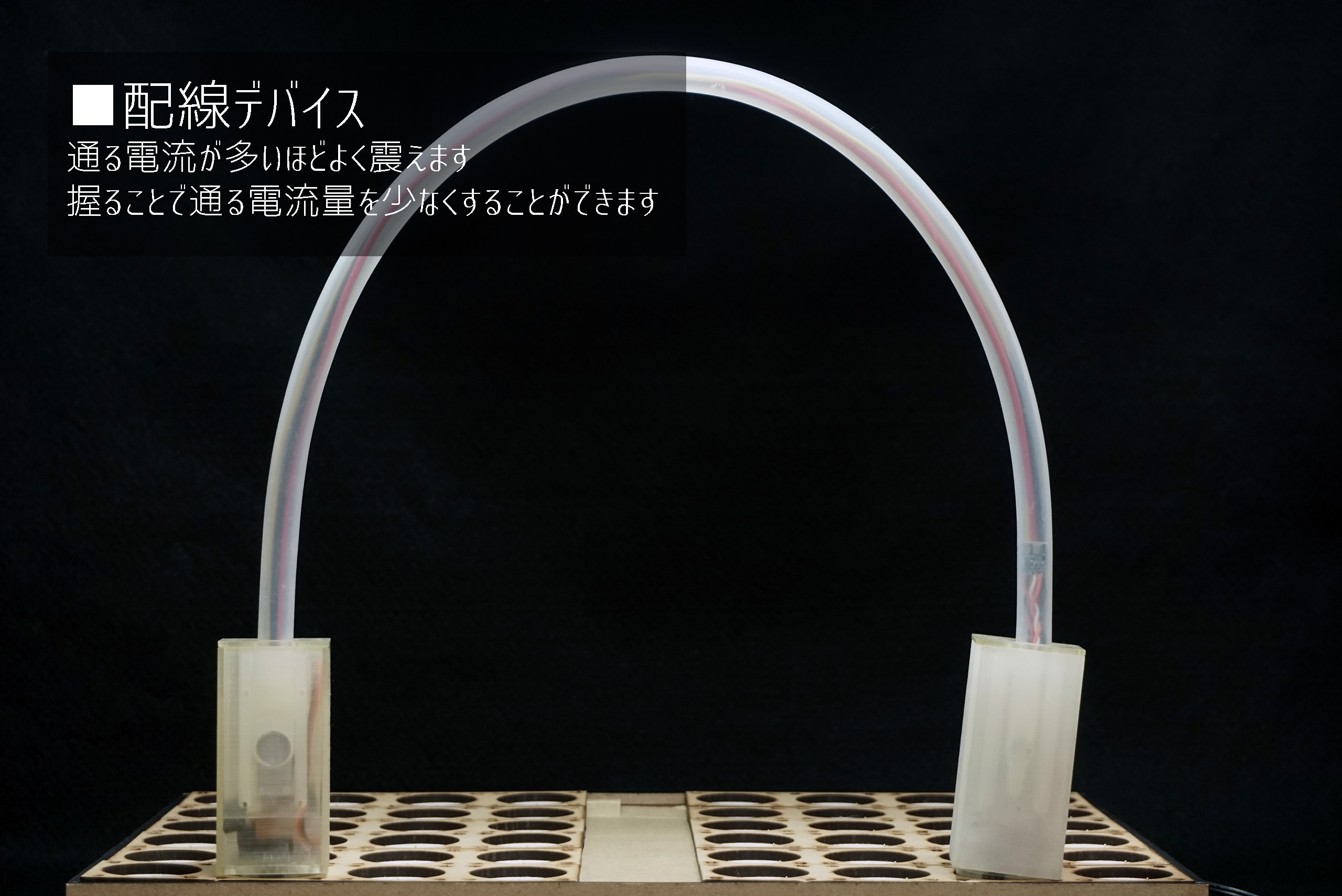 中核を担うのは,「電気を触れて感じ、触って操作できる配線」デバイスです.これは,内部を通過する電流が多ければ多いほど高い頻度で震えます.配線を握ると,内部を通過する電流をせき止めることができます,力加減を変えることで、通過する電流量を連続的に変化させることもできます.