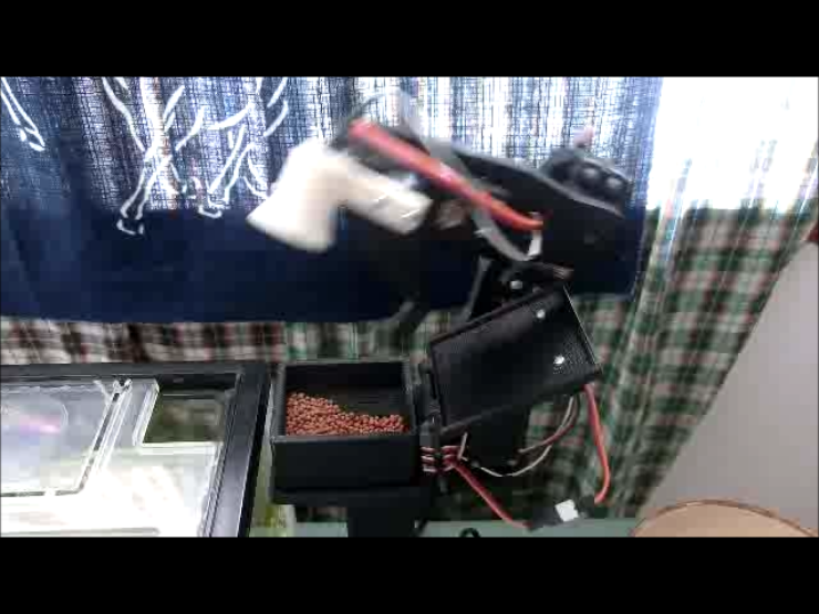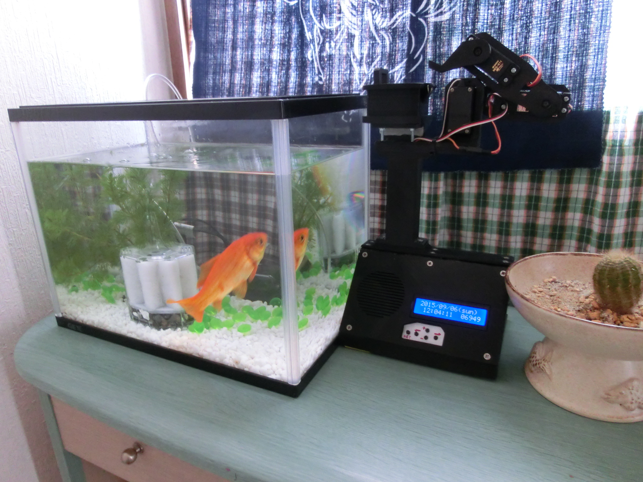 設定した時間が来るとスピーカーで時報を喋って金魚にエサをやるロボットです。毎回少量のエサを安定してあげる事と、エサが湿って固まらないようにする事に工夫をこらしました。