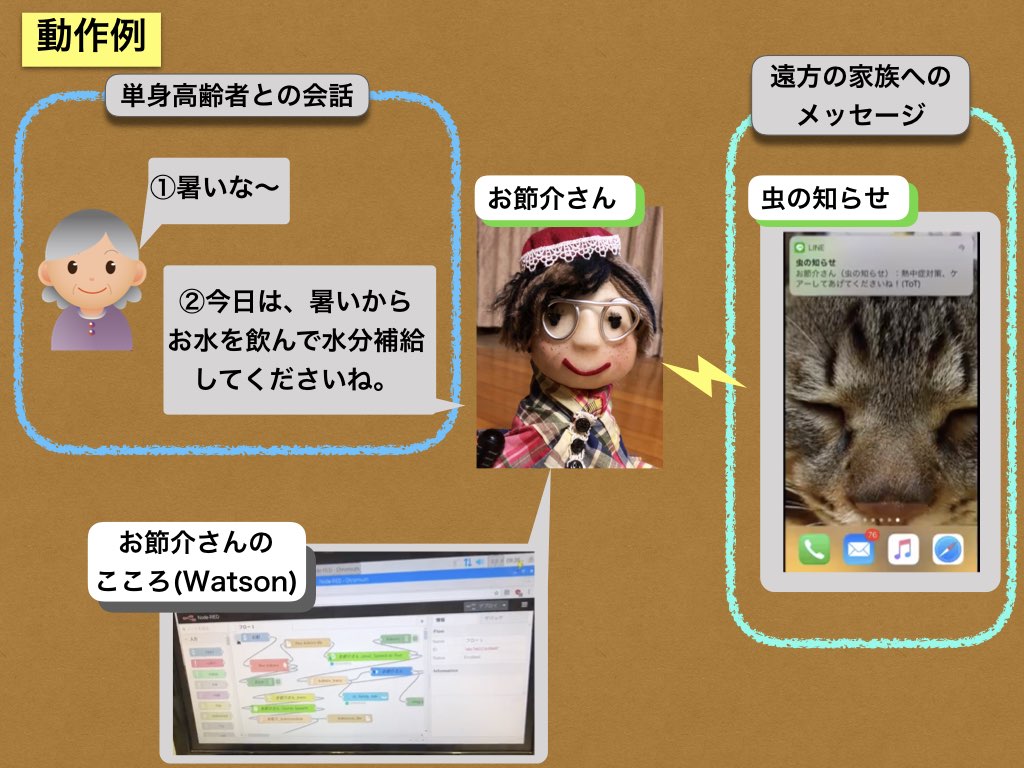 更に、遠方のご家族へは、上記の会話情報から時間差で、健康長寿を実現する単身高齢者との会話を盛り上げ、気を利かせられるコンテンツを「虫の知らせ」から提供します