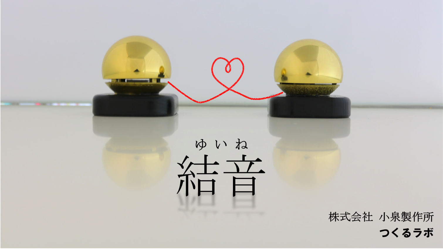 結音は、「快音」にこだわるモノづくりを続ける小泉製作所(富山県高岡市)の\\"おりん\\"を使った、新しいコミュニケーションデバイスです。おりんがペアになっており、一方のおりんが鳴らされたことを検知し、もう一方のおりんと通信することによって、もう一方のおりんを打りんすることができます。