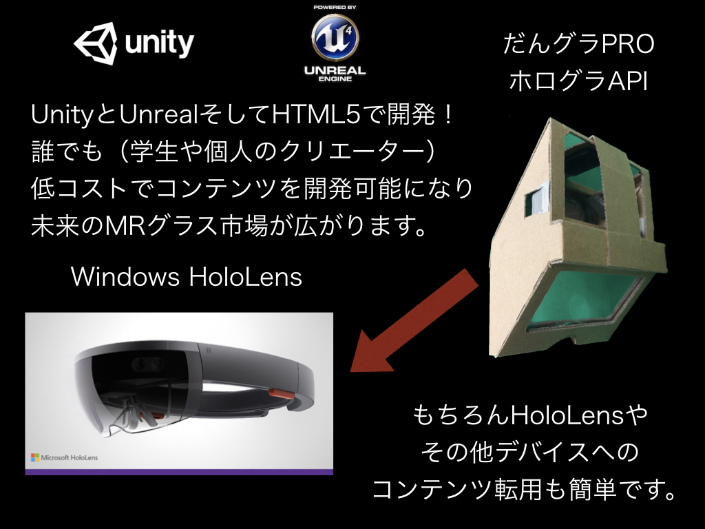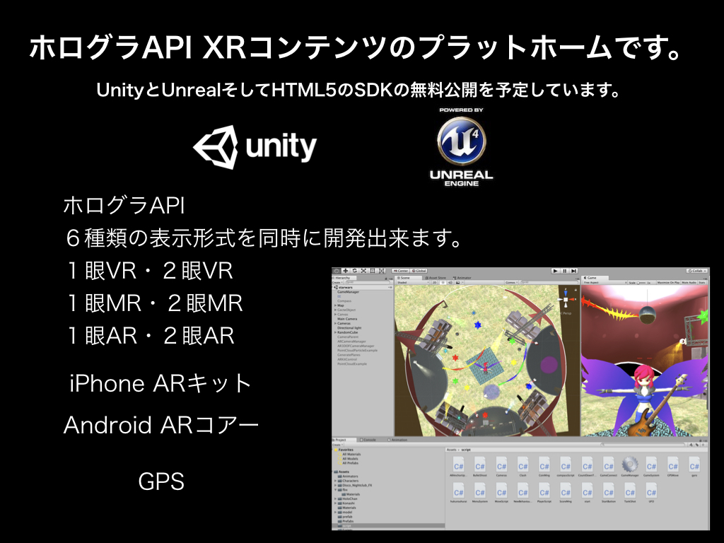 2:ホログラAPIを、XRコンテンツの開発プラットホームAPIとし、UnityとUnrealそしてHTML5のSDKの無料公開を予定しています。