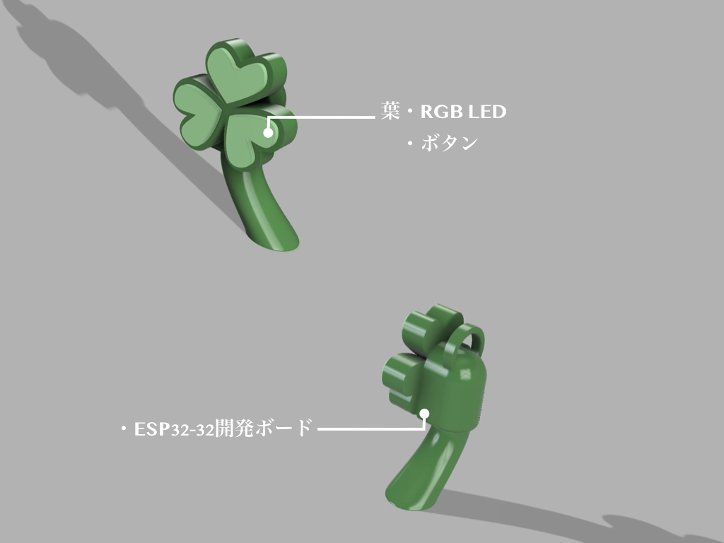 「MITSUBA」は電池式となっていて、葉となる3つの部分にそれぞれフルカラーLEDが内蔵されています。アプリから当日のタスクを受信し、それぞれの葉にタスクに応じた色が表示され、その日のタスクがいくつ残っているかをスマホを見ずに確認する事が出来ます。また、葉は押しボタン式となっていてタスクか完了した際に押すとLEDが消え、タスクが完了した事がスマホに連携されます。