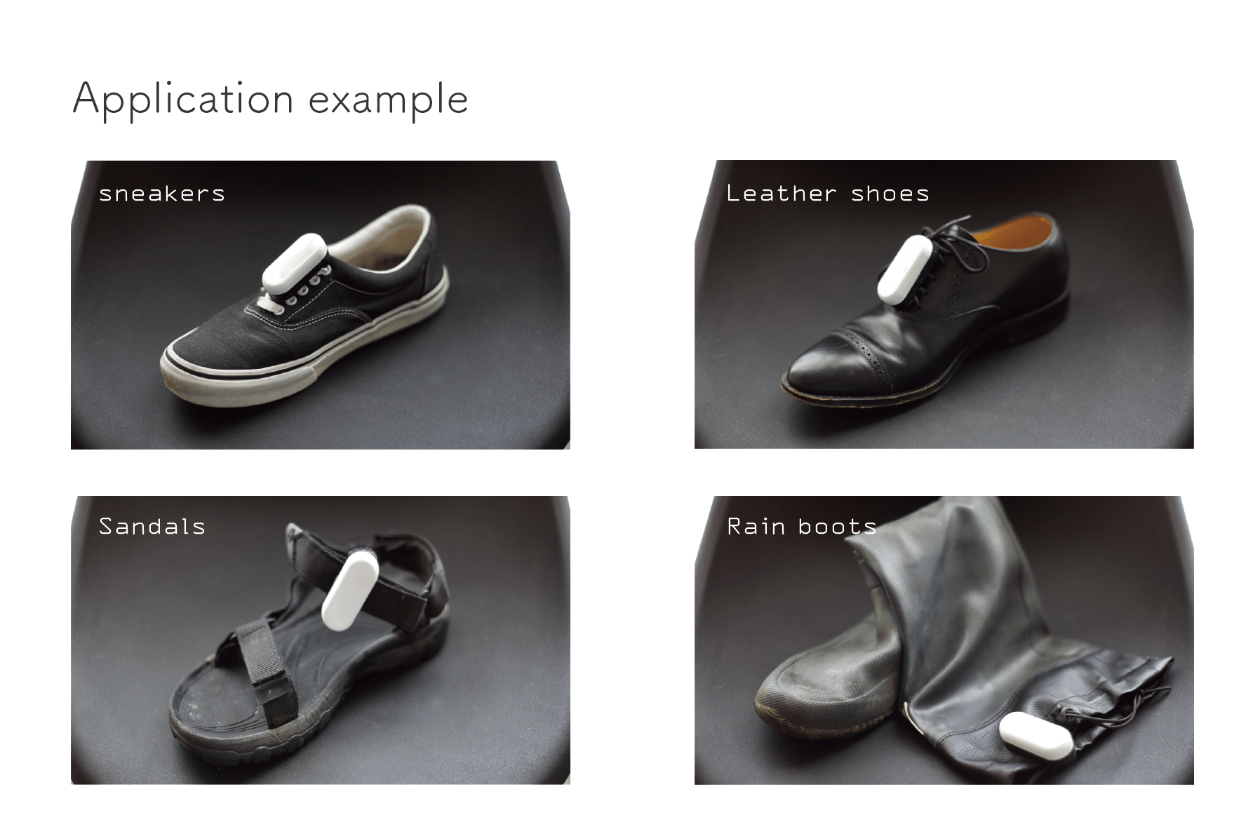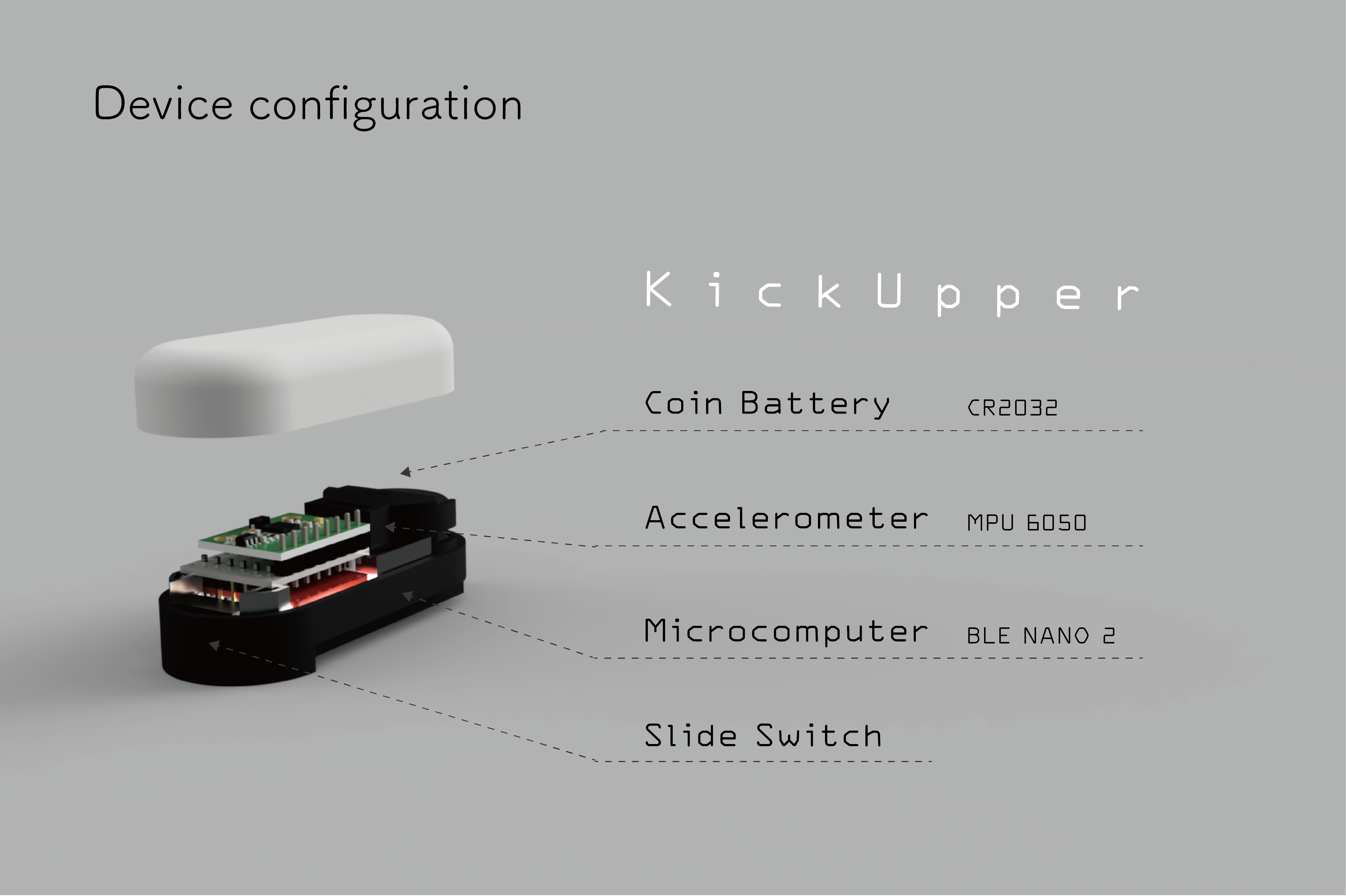 KickUpper は加速度センサー(MPU6050)とBLE搭載マイコン(BLE NANO)が内蔵された小型デバイスです。どんな靴にも装着することができ、スマートフォンと連携することで靴飛ばしの飛距離や靴の回転角度を計測することができます。