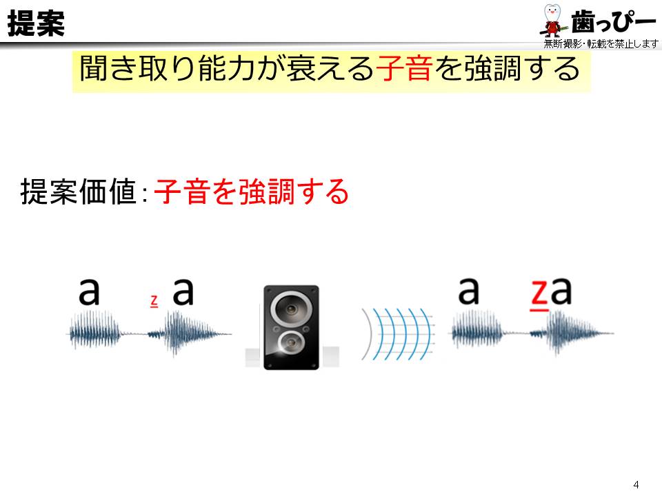 我々は、音声明瞭化技術によって、老人性難聴で聞き取り難くなる子音を強調しすることによって、高齢者にクリアな音を届ける。高齢者に音声によるインプットを増やすことは、アルツハイマー病、うつ病の発症率抑制(1)にも効果がある。その結果、高齢者が知的な生活習慣や良好なコミュニケーションを維持することで、高齢者の社会参加や健康寿命を延ばすことに貢献し、当該課題の解決を試みる。