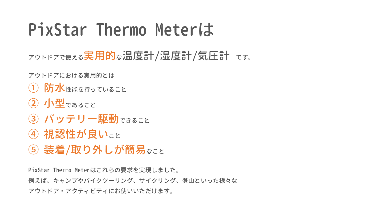 アウトドアやアクティビティ好きな人(キャンプ、バイク、サイクリング、登山等なんでも)、アウトドアで温度・湿度・気圧を知りたい人
