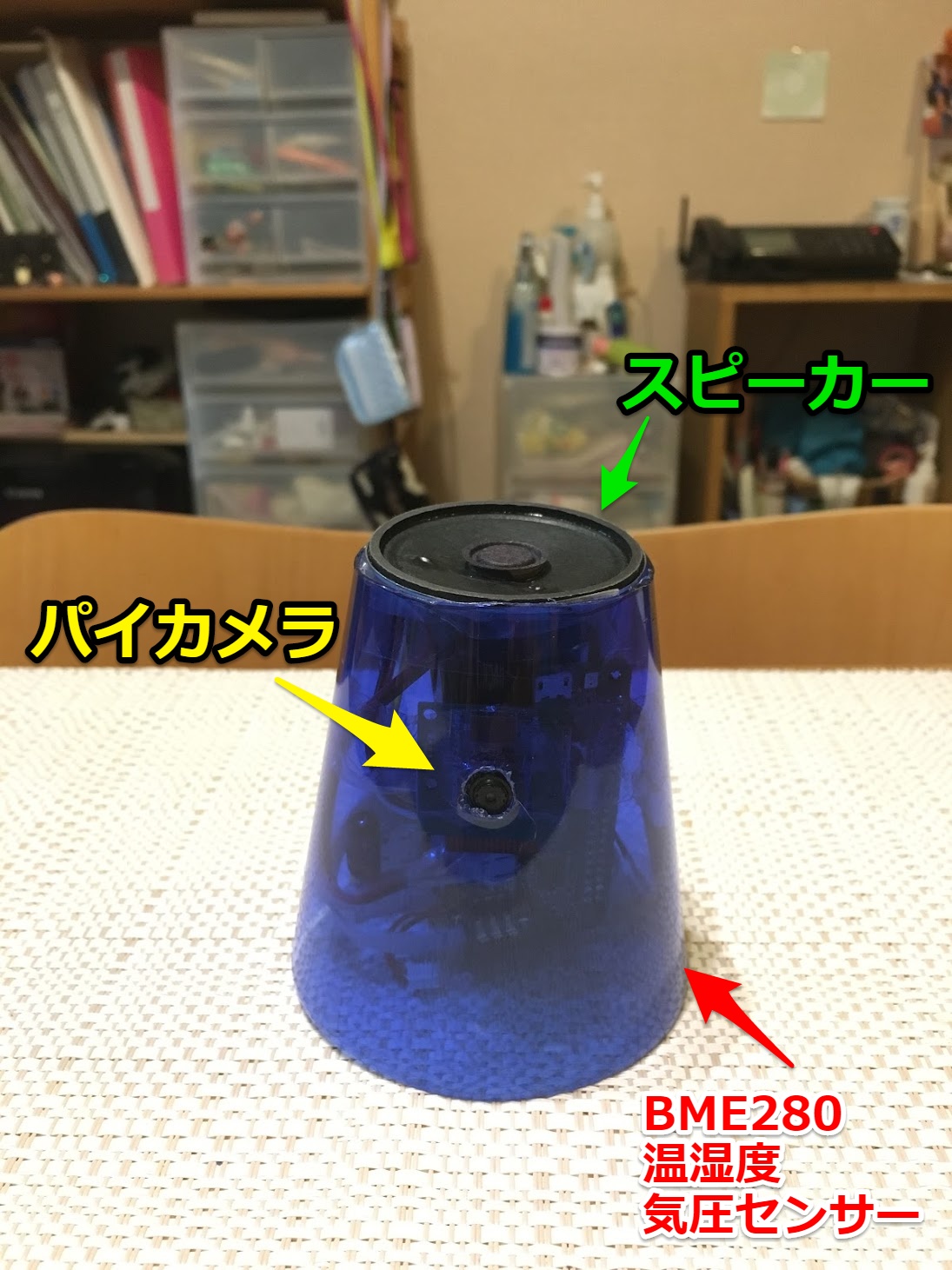 - おはよう: 言った人の顔を確認して、今日の予定、行き先の天気、好みのニュースなどを読み上げてくれます。BLE280センサにより部屋の温湿度を測り、最適なエアコン設定をしてくれます。