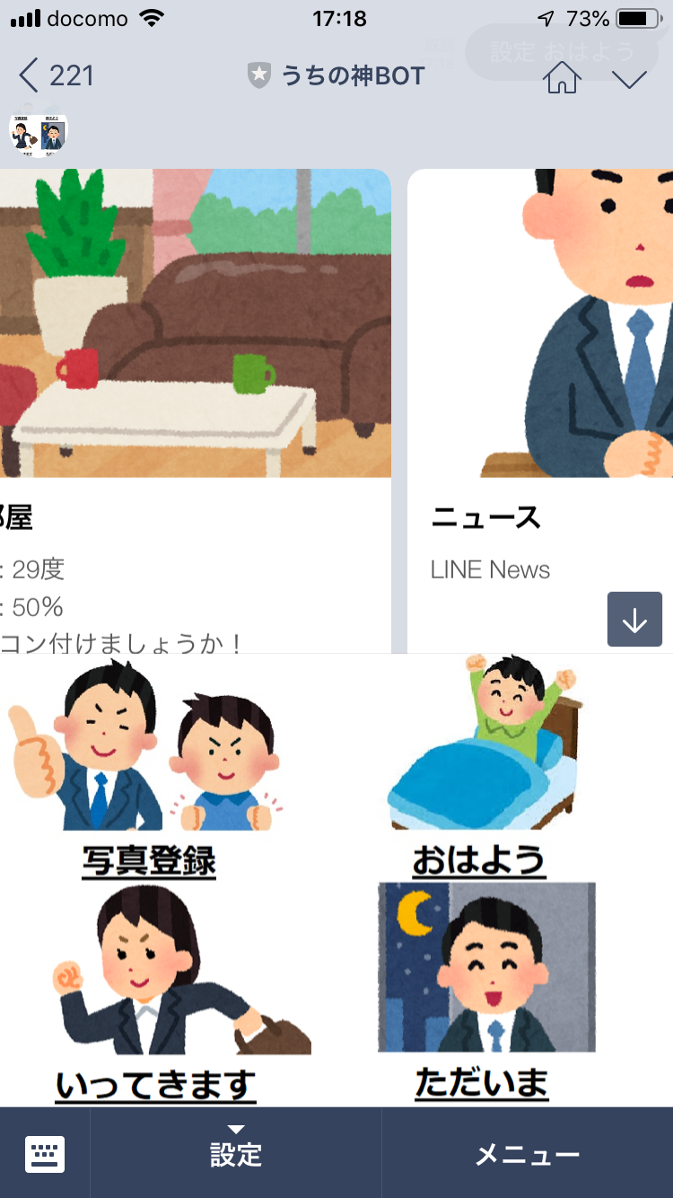 - いってきます: 今日の恰好から、最適なアクセサリやファッションを提案してくれます。出がけに電気、エアコンなどを消してくれます。ニュースなどをLINE Botに送っておいてくれます。