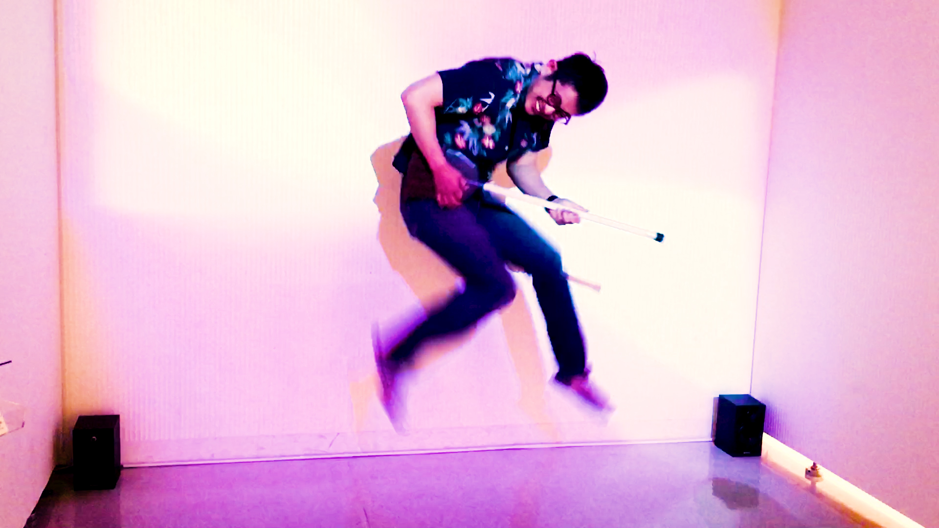 エアギターするとギターの音が鳴り、映像照明が連動して演奏者に光が当たる。次第に周囲の人々はオーディエンスになっていくと、その場がステージへと変化し演奏者・観客は作品の一部となる。それらの相互作用によって演奏者はロックスターとなる。