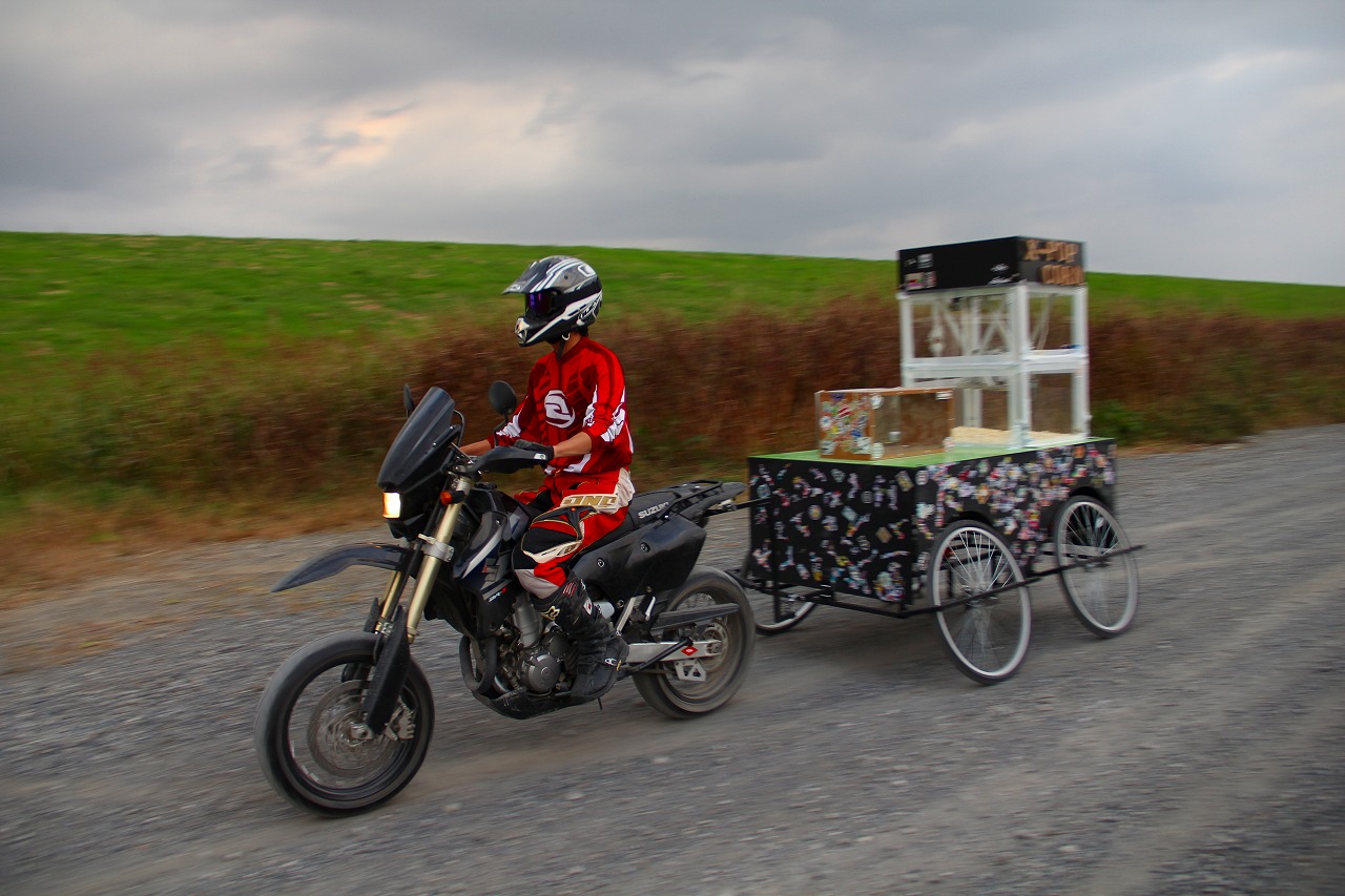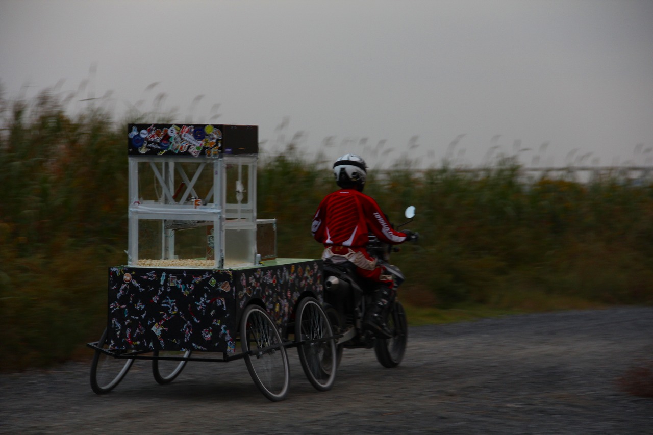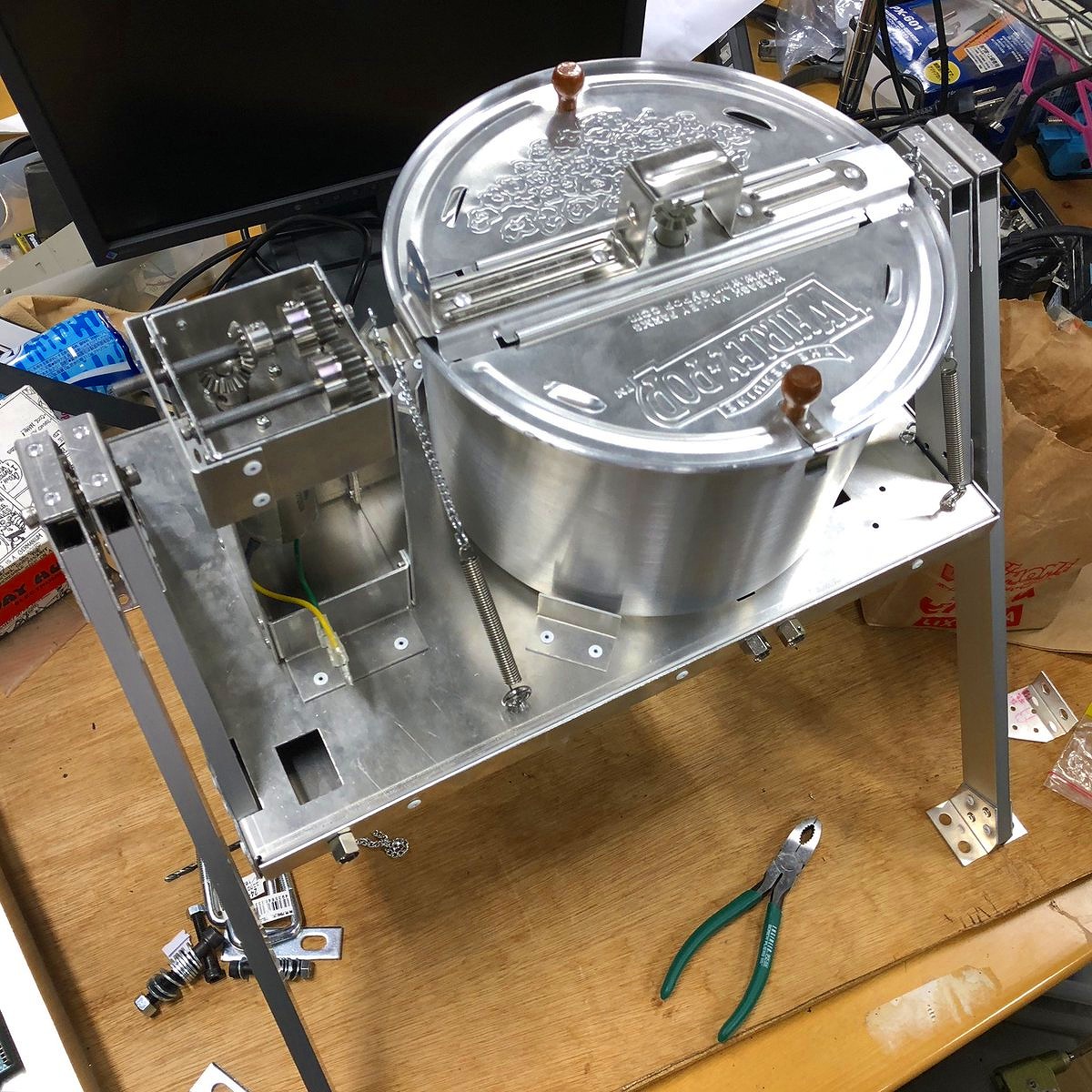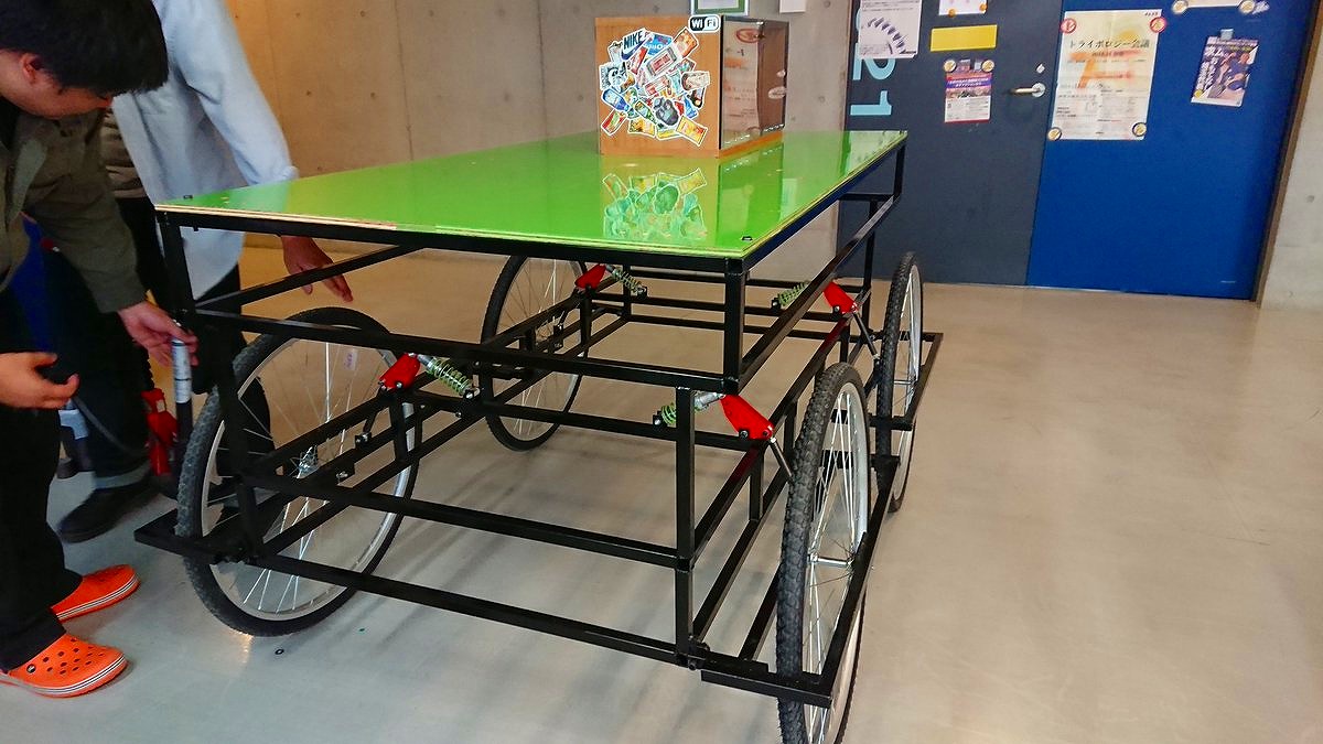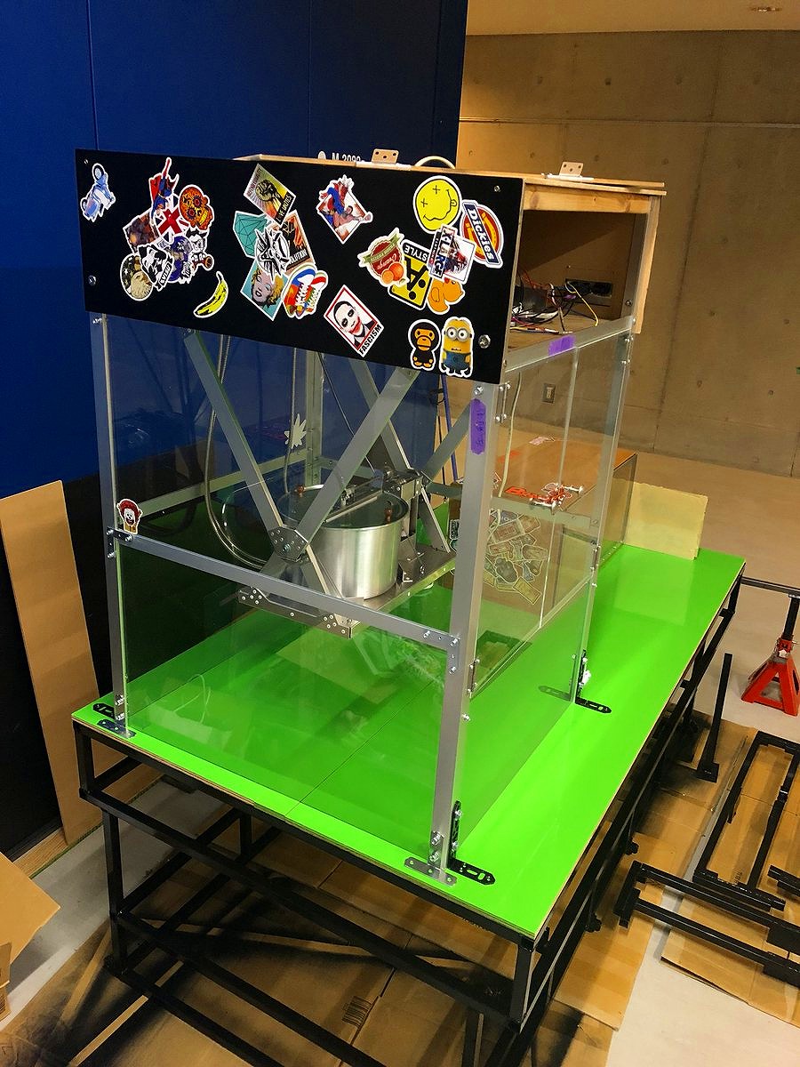 ポップコーン出展に関する話し合いを進めている内に、折角ならものつくり大学の魅力も宣伝しようということで、ポップコーンを販売する移動販売車"ポップコーンワゴン"を、一からものつくり大学で作ろうということになりました。しかし、本プロジェクトのメンバーが所属している研究室の三井准教授から、「ただのポップコーンワゴンでは面白くない!悪路も走行できた方が絶対に面白い!」とのことで、本作品が誕生しました。悪路を走行するためには、車体そのものがそれに耐えうる強度が必要でした。なので、車体は全てスチール角パイプを溶接して製作しています。それだけでは無く、悪路走行時の衝撃を吸収するために、サスペンションをベルクランク方式にて搭載しています。車輪は、いわゆるママチャリのスポークホイールにブロックタイヤを履かせ走破性を向上させています。実際にポップコーンを調理する部分である"ポップコーンボックス"には、市販のホットプレートを分解し電装類を再配線することで熱源を確保、ポップコーンを熱し、弾けさせる鍋には、内部にかき混ぜ機構を設け、かさ歯車とシャフトを介して、タミヤ製の540モーターで回転させています。そして、制御部分には"Arduino"・サーモセンサ・エンコーダを用いて、かき混ぜ機構の回転数制御とホットプレートの温度制御を行っています。また、鍋を載せる台座はボックス内の天井に吊り下げ方式で固定され、回転機構を有しているため、ポップコーンを全て弾けさせたタイミングで鍋をひっくり返すことができます。外観にも手を抜くことはなく、作業台とサスペンションにはグリーンを、ベルクランク方式の連結パーツにはレッドを、車体のスチール角パイプにはシャーシブラックを施し、ボディにあたる部分にはブラックのプラスチックダンボールの上から、ステッカーボムのシートを迷彩状に切り出す"ステッカーボム迷彩"を施し、ポップコーンワゴン全体からエクストリーム感を演出しています。同時に、日光・雨対策と浦安にある某テーマパークのような、エクストリームの中にアンティークなお洒落感を演出するため、グリーンの大きなパラソルを使用しています。