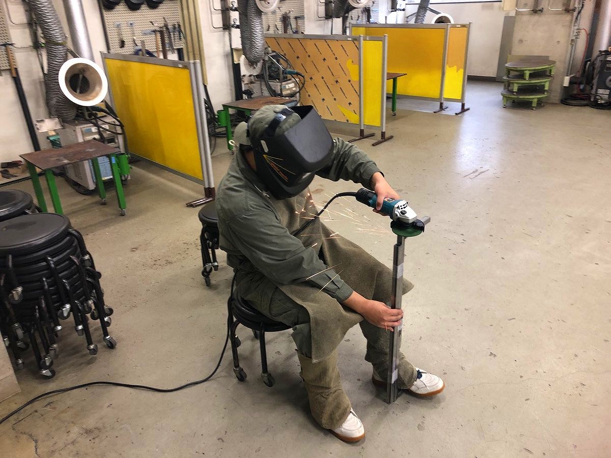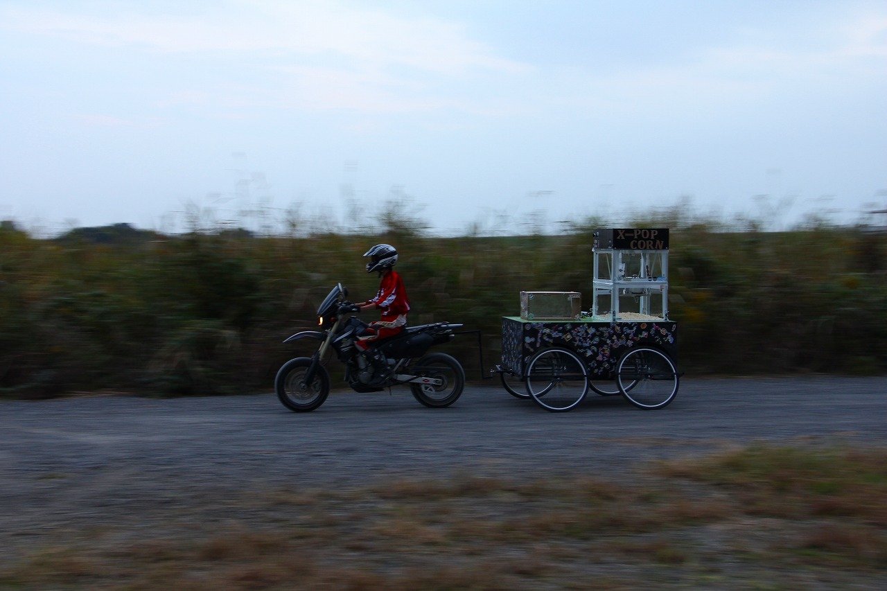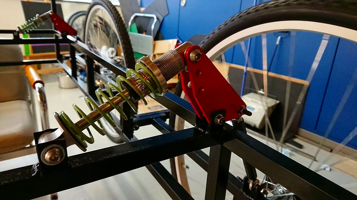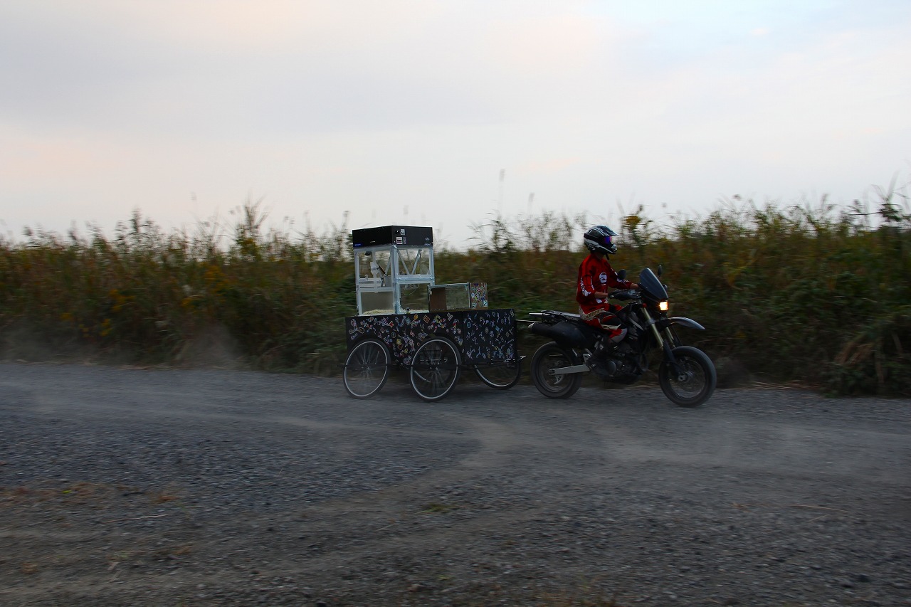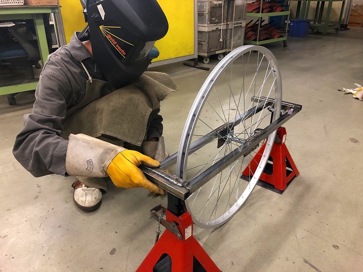 ポップコーン出展に関する話し合いを進めている内に、折角ならものつくり大学の魅力も宣伝しようということで、ポップコーンを販売する移動販売車"ポップコーンワゴン"を、一からものつくり大学で作ろうということになりました。しかし、本プロジェクトのメンバーが所属している研究室の三井准教授から、「ただのポップコーンワゴンでは面白くない!悪路も走行できた方が絶対に面白い!」とのことで、本作品が誕生しました。悪路を走行するためには、車体そのものがそれに耐えうる強度が必要でした。なので、車体は全てスチール角パイプを溶接して製作しています。それだけでは無く、悪路走行時の衝撃を吸収するために、サスペンションをベルクランク方式にて搭載しています。車輪は、いわゆるママチャリのスポークホイールにブロックタイヤを履かせ走破性を向上させています。実際にポップコーンを調理する部分である"ポップコーンボックス"には、市販のホットプレートを分解し電装類を再配線することで熱源を確保、ポップコーンを熱し、弾けさせる鍋には、内部にかき混ぜ機構を設け、かさ歯車とシャフトを介して、タミヤ製の540モーターで回転させています。そして、制御部分には"Arduino"・サーモセンサ・エンコーダを用いて、かき混ぜ機構の回転数制御とホットプレートの温度制御を行っています。また、鍋を載せる台座はボックス内の天井に吊り下げ方式で固定され、回転機構を有しているため、ポップコーンを全て弾けさせたタイミングで鍋をひっくり返すことができます。外観にも手を抜くことはなく、作業台とサスペンションにはグリーンを、ベルクランク方式の連結パーツにはレッドを、車体のスチール角パイプにはシャーシブラックを施し、ボディにあたる部分にはブラックのプラスチックダンボールの上から、ステッカーボムのシートを迷彩状に切り出す"ステッカーボム迷彩"を施し、ポップコーンワゴン全体からエクストリーム感を演出しています。同時に、日光・雨対策と浦安にある某テーマパークのような、エクストリームの中にアンティークなお洒落感を演出するため、グリーンの大きなパラソルを使用しています。