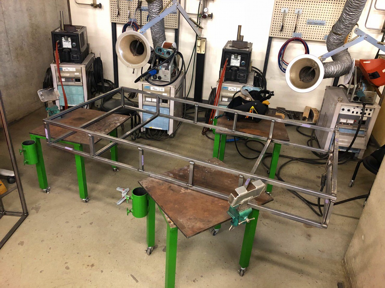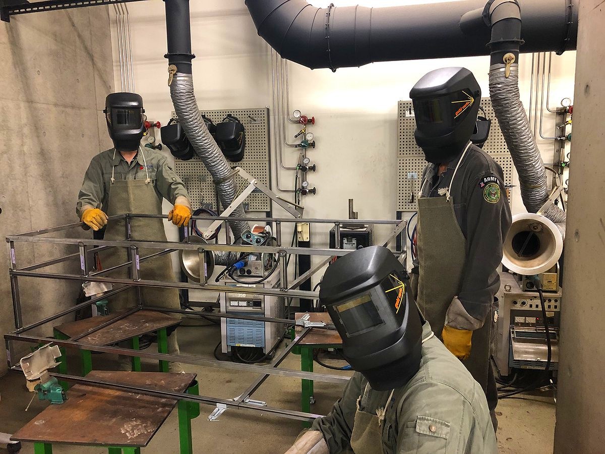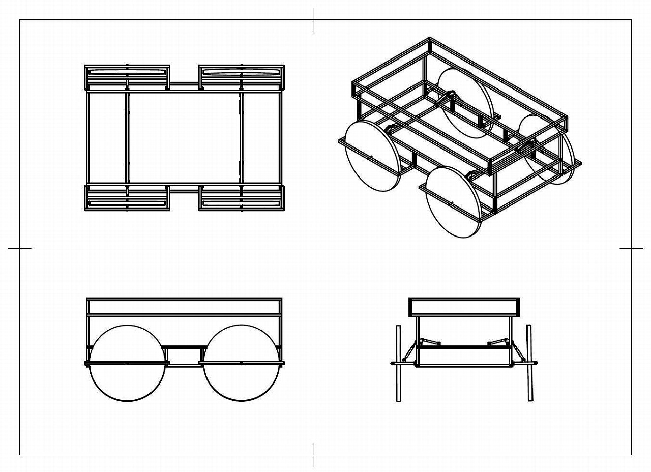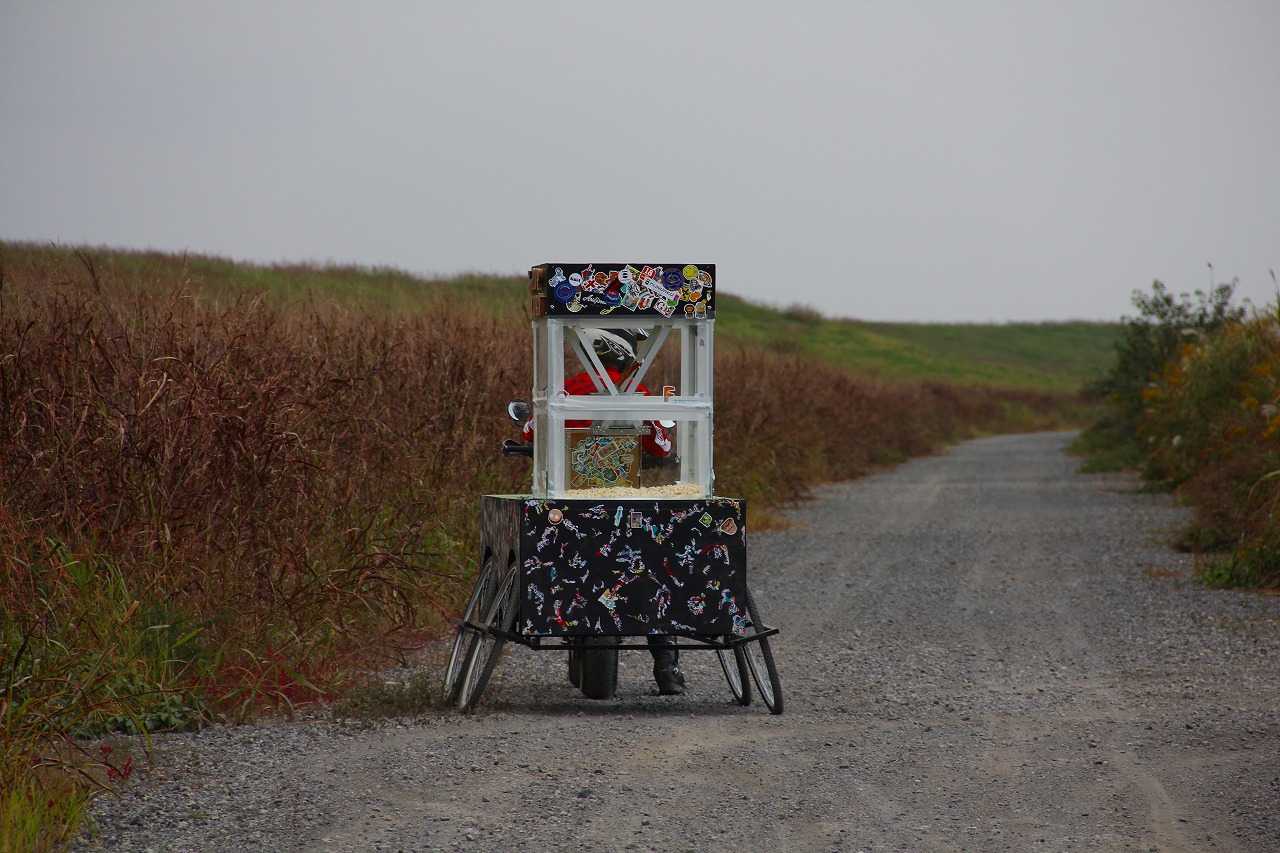 ポップコーン出展に関する話し合いを進めている内に、折角ならものつくり大学の魅力も宣伝しようということで、ポップコーンを販売する移動販売車"ポップコーンワゴン"を、一からものつくり大学で作ろうということになりました。しかし、本プロジェクトのメンバーが所属している研究室の三井准教授から、「ただのポップコーンワゴンでは面白くない!悪路も走行できた方が絶対に面白い!」とのことで、本作品が誕生しました。悪路を走行するためには、車体そのものがそれに耐えうる強度が必要でした。なので、車体は全てスチール角パイプを溶接して製作しています。それだけでは無く、悪路走行時の衝撃を吸収するために、サスペンションをベルクランク方式にて搭載しています。車輪は、いわゆるママチャリのスポークホイールにブロックタイヤを履かせ走破性を向上させています。実際にポップコーンを調理する部分である"ポップコーンボックス"には、市販のホットプレートを分解し電装類を再配線することで熱源を確保、ポップコーンを熱し、弾けさせる鍋には、内部にかき混ぜ機構を設け、かさ歯車とシャフトを介して、タミヤ製の540モーターで回転させています。そして、制御部分には"Arduino"・サーモセンサ・エンコーダを用いて、かき混ぜ機構の回転数制御とホットプレートの温度制御を行っています。また、鍋を載せる台座はボックス内の天井に吊り下げ方式で固定され、回転機構を有しているため、ポップコーンを全て弾けさせたタイミングで鍋をひっくり返すことができます。外観にも手を抜くことはなく、作業台とサスペンションにはグリーンを、ベルクランク方式の連結パーツにはレッドを、車体のスチール角パイプにはシャーシブラックを施し、ボディにあたる部分にはブラックのプラスチックダンボールの上から、ステッカーボムのシートを迷彩状に切り出す"ステッカーボム迷彩"を施し、ポップコーンワゴン全体からエクストリーム感を演出しています。同時に、日光・雨対策と浦安にある某テーマパークのような、エクストリームの中にアンティークなお洒落感を演出するため、グリーンの大きなパラソルを使用しています。