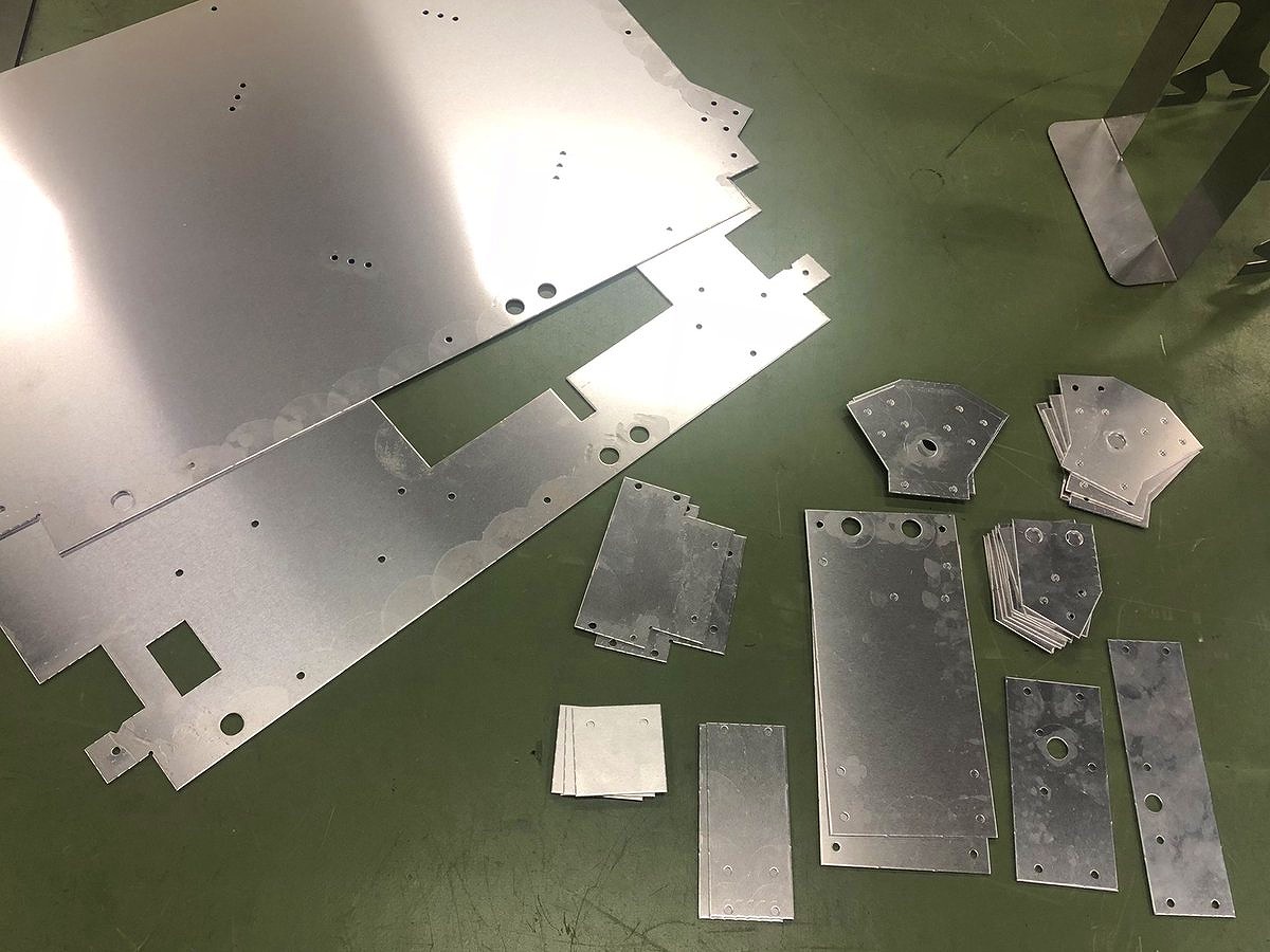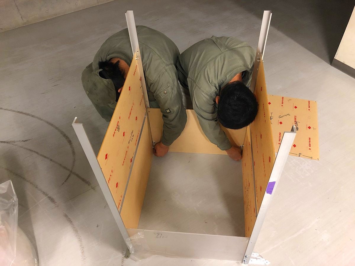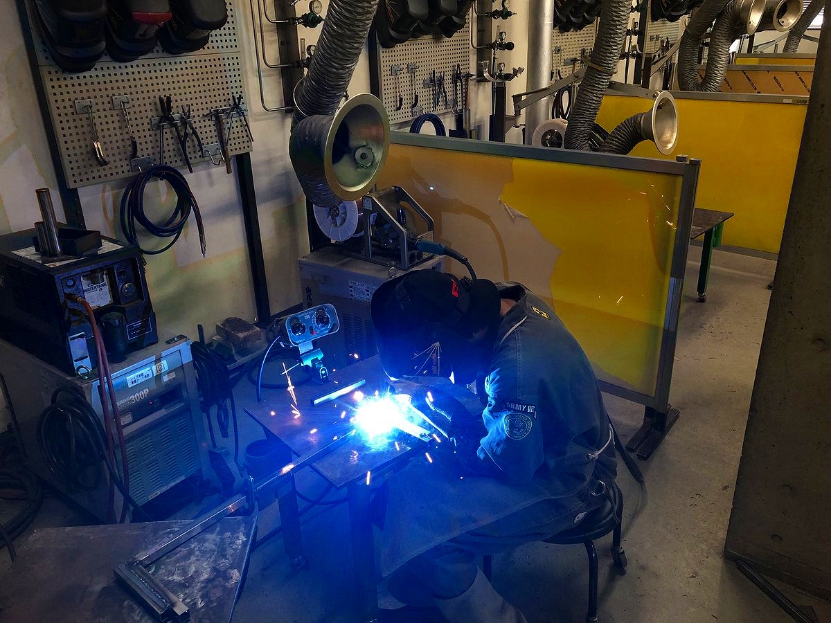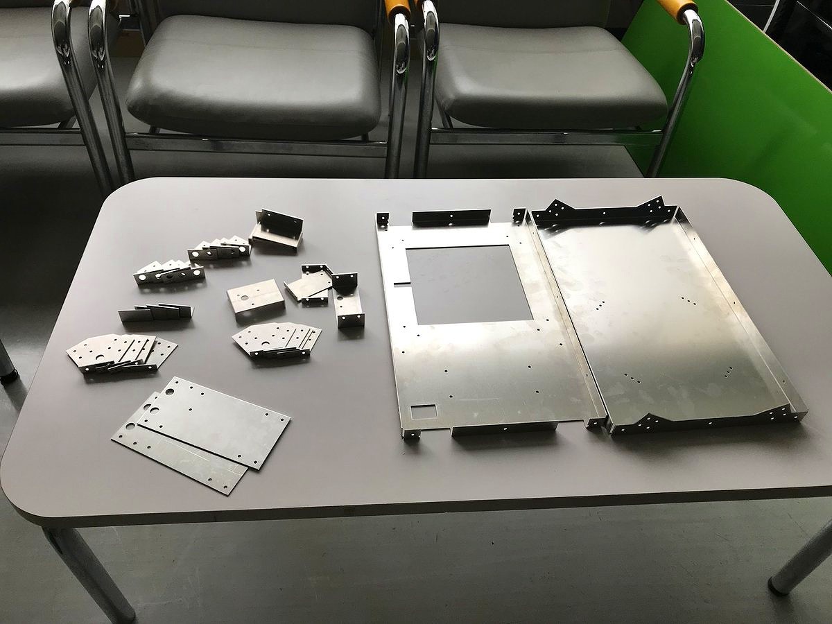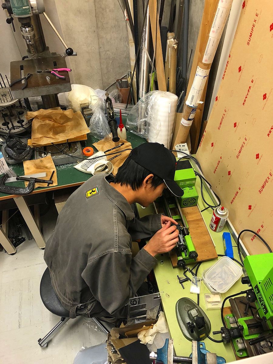 ポップコーン出展に関する話し合いを進めている内に、折角ならものつくり大学の魅力も宣伝しようということで、ポップコーンを販売する移動販売車"ポップコーンワゴン"を、一からものつくり大学で作ろうということになりました。しかし、本プロジェクトのメンバーが所属している研究室の三井准教授から、「ただのポップコーンワゴンでは面白くない!悪路も走行できた方が絶対に面白い!」とのことで、本作品が誕生しました。悪路を走行するためには、車体そのものがそれに耐えうる強度が必要でした。なので、車体は全てスチール角パイプを溶接して製作しています。それだけでは無く、悪路走行時の衝撃を吸収するために、サスペンションをベルクランク方式にて搭載しています。車輪は、いわゆるママチャリのスポークホイールにブロックタイヤを履かせ走破性を向上させています。実際にポップコーンを調理する部分である"ポップコーンボックス"には、市販のホットプレートを分解し電装類を再配線することで熱源を確保、ポップコーンを熱し、弾けさせる鍋には、内部にかき混ぜ機構を設け、かさ歯車とシャフトを介して、タミヤ製の540モーターで回転させています。そして、制御部分には"Arduino"・サーモセンサ・エンコーダを用いて、かき混ぜ機構の回転数制御とホットプレートの温度制御を行っています。また、鍋を載せる台座はボックス内の天井に吊り下げ方式で固定され、回転機構を有しているため、ポップコーンを全て弾けさせたタイミングで鍋をひっくり返すことができます。外観にも手を抜くことはなく、作業台とサスペンションにはグリーンを、ベルクランク方式の連結パーツにはレッドを、車体のスチール角パイプにはシャーシブラックを施し、ボディにあたる部分にはブラックのプラスチックダンボールの上から、ステッカーボムのシートを迷彩状に切り出す"ステッカーボム迷彩"を施し、ポップコーンワゴン全体からエクストリーム感を演出しています。同時に、日光・雨対策と浦安にある某テーマパークのような、エクストリームの中にアンティークなお洒落感を演出するため、グリーンの大きなパラソルを使用しています。
