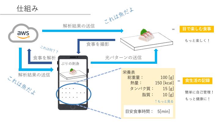 その結果をエレクトリカルプレートとスマートフォン側に通知することで、光らせ方を変更します。また、同時におおよその食事の栄養や分量についても記録します。これが食事管理に使用する仕組みです。