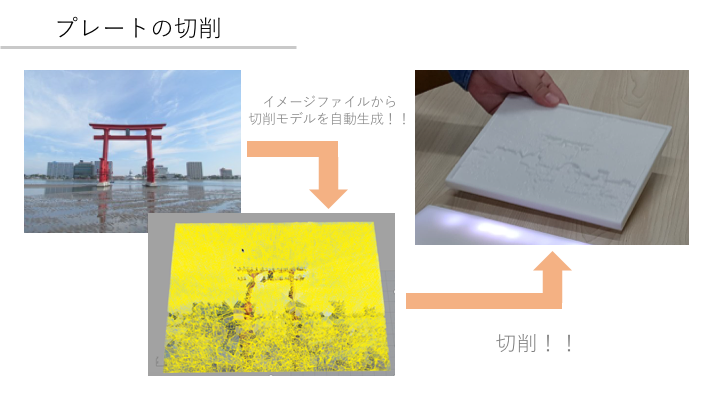 プレート内部の照明は人造大理石の形状によって反射の仕方が変わります。照明の点灯からデザインを表現するだけでなく、様々な形状でプレート表面のお皿部分を切削することで、また違った光り方を楽しめます。