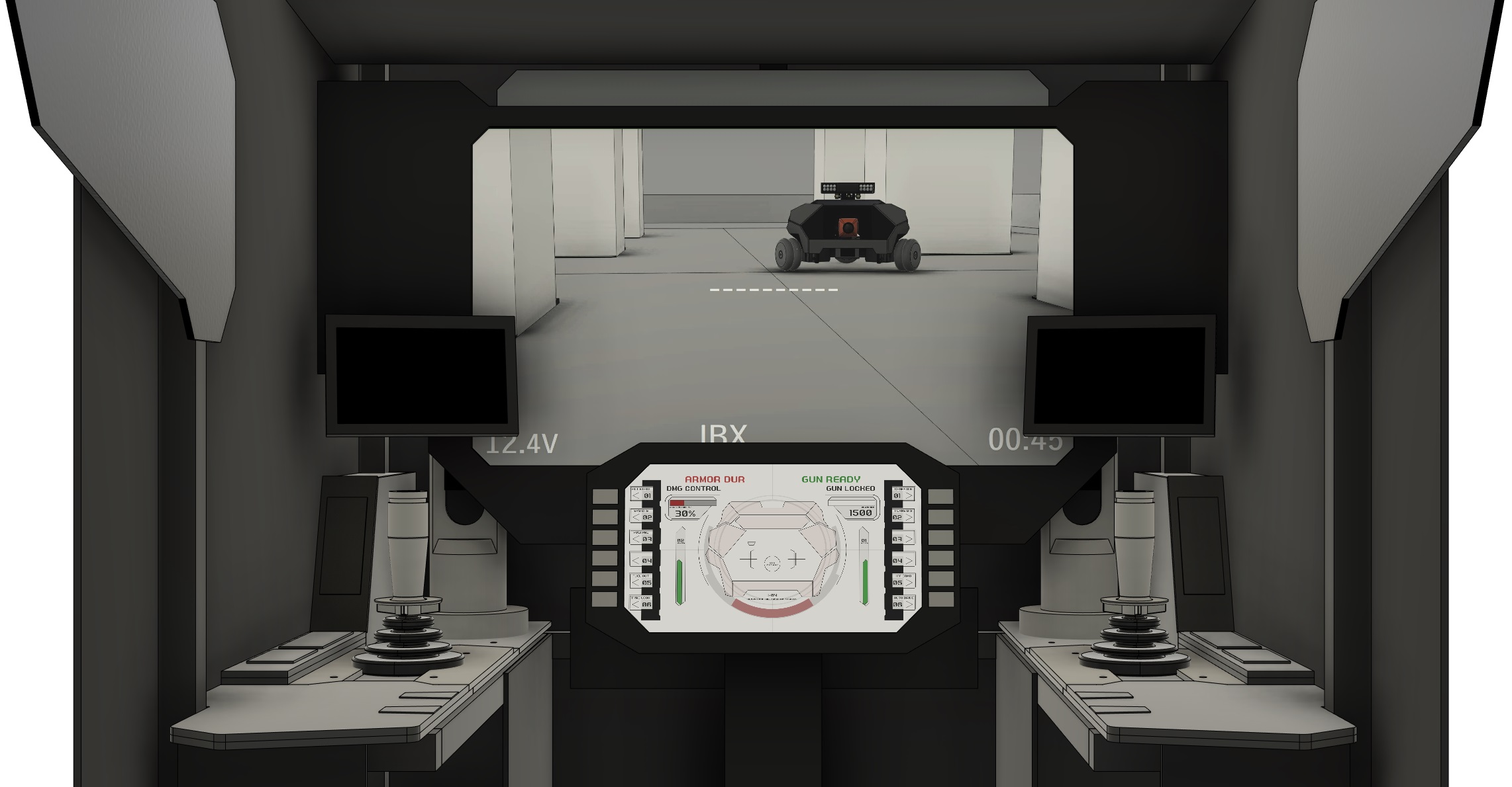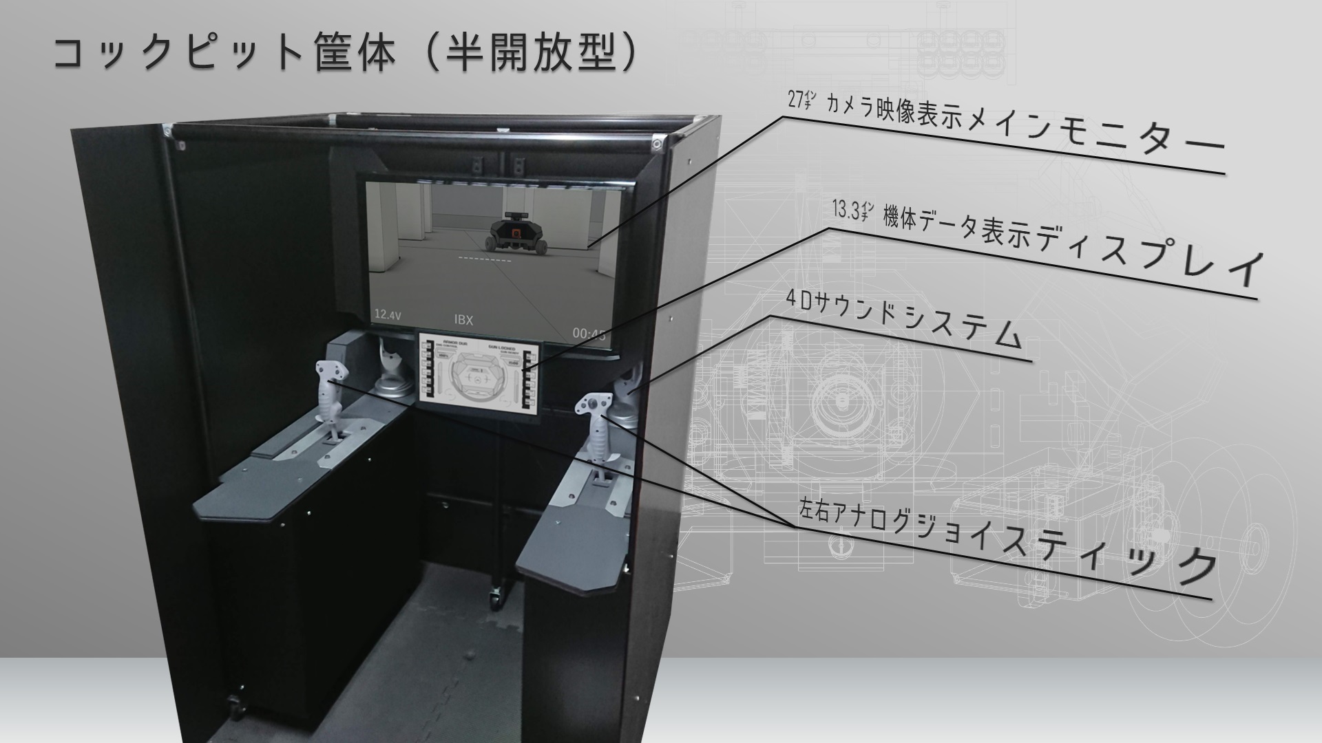 小型のロボットに搭載されたカメラ映像やセンサー値が「コックピット」に無線で送信され、体験者はコックピットからまるで「ロボットに乗っているかのように」ロボットを操作し、AIや他のプレイヤーと対戦ゲームができるエンターテイメントです。