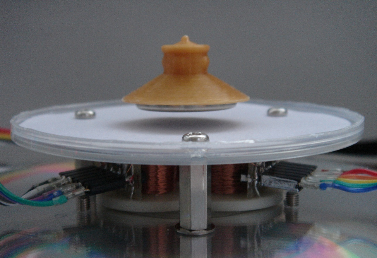 本作品は磁気の斥力によって、磁石を浮上させます。