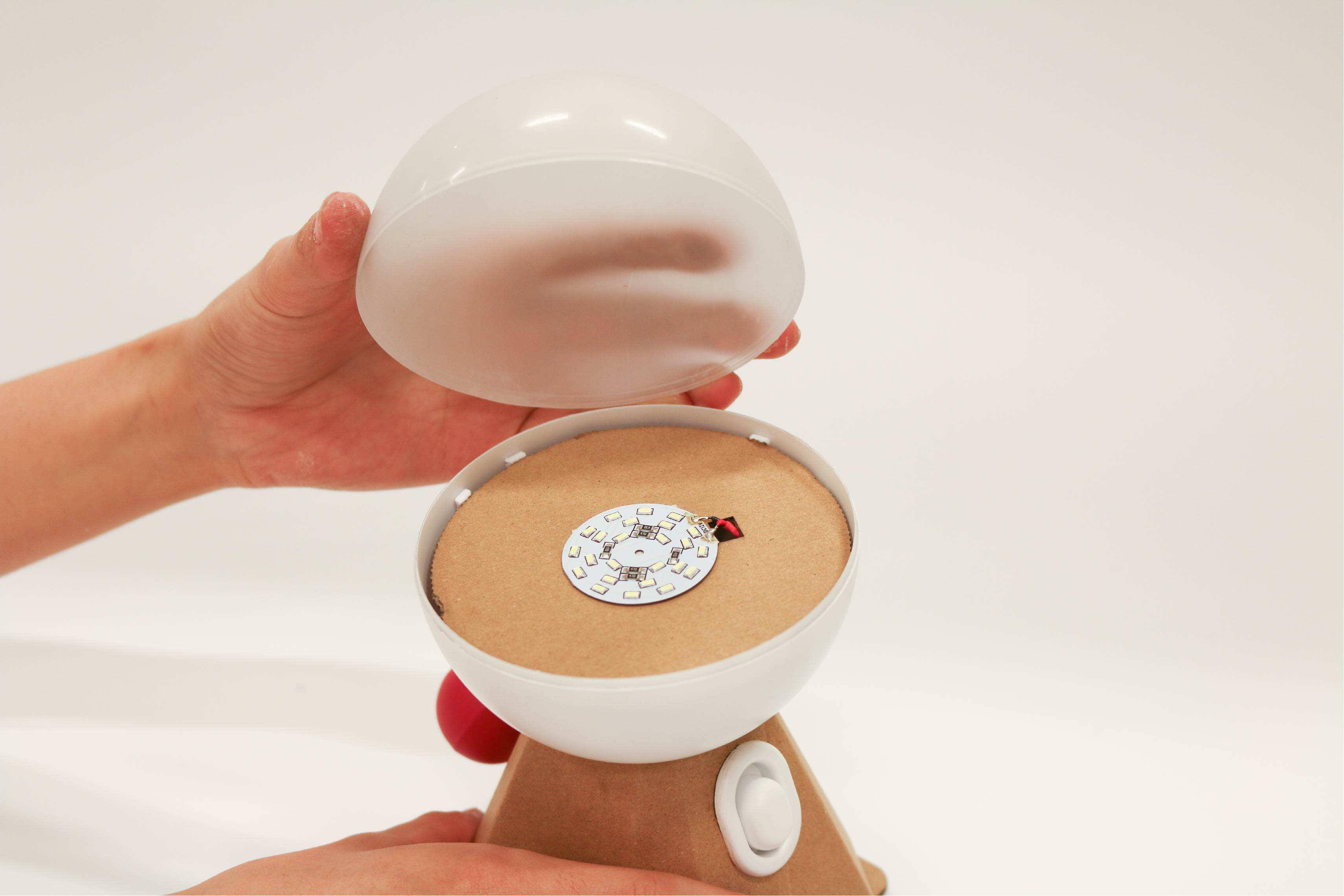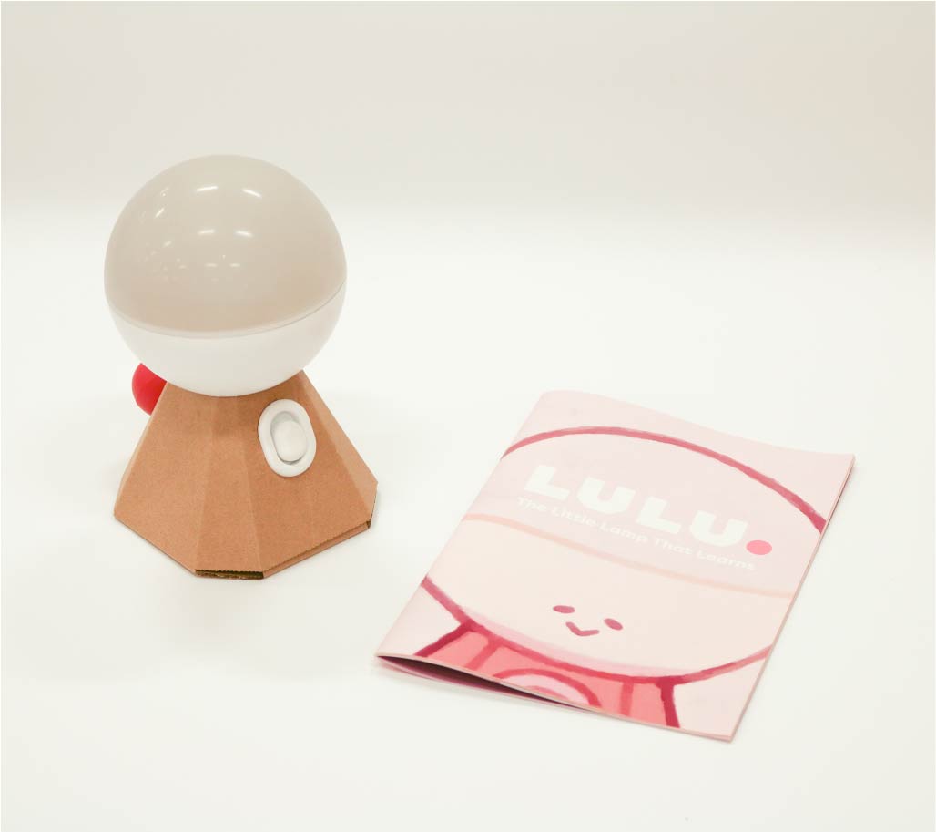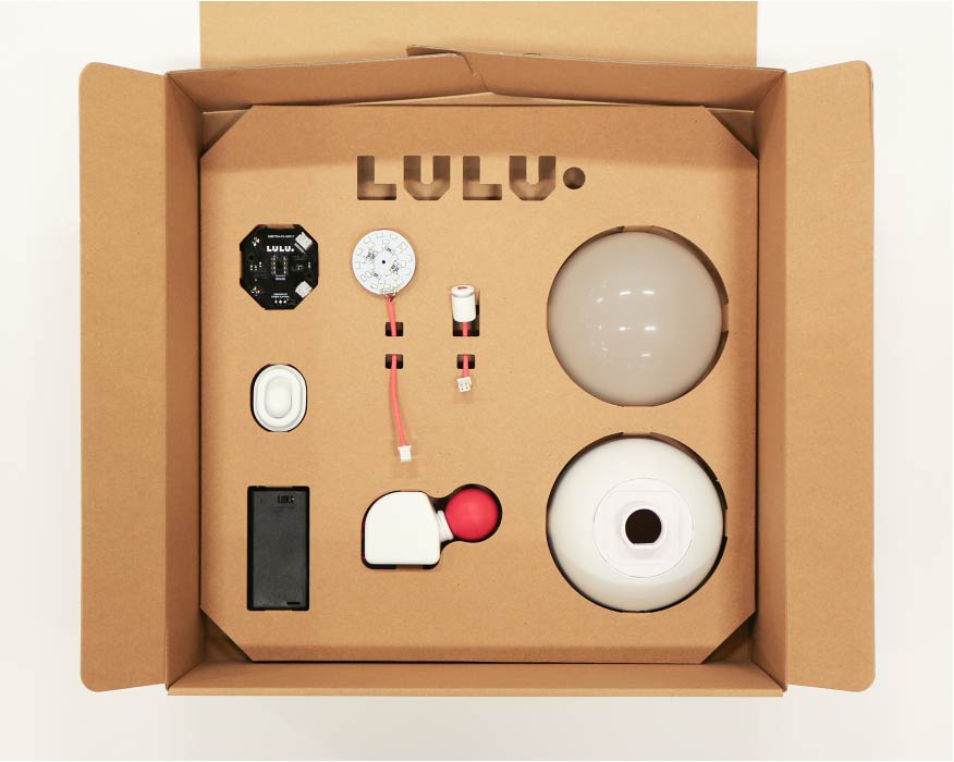 キットには、脳型基盤・各種部品・アセンブリガイド・絵本が入っています。ユーザーはまずガイドを見ながらキットを組み立てますが、はじめ、Luluはスイッチの意味を知りません。その代わり、Luluは好奇心旺盛で、いつも周りの明るさをマネします。明るいところにいると、Luluも明るくなるし、暗いところにいるときは、Luluも暗くなります。ただし、ユーザーがスイッチの意味と明るさとの関係性をLuluに教えてあげることで、ふつうのランプとして機能するようになります。