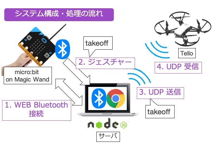 3. 魔法の杖風デバイスに搭載したmicro:bitがジェスチャーを検出すると、PCにWeb Bluetoothでジェスチャーデータが送信され、対応した命令をTelloにUDPで送信