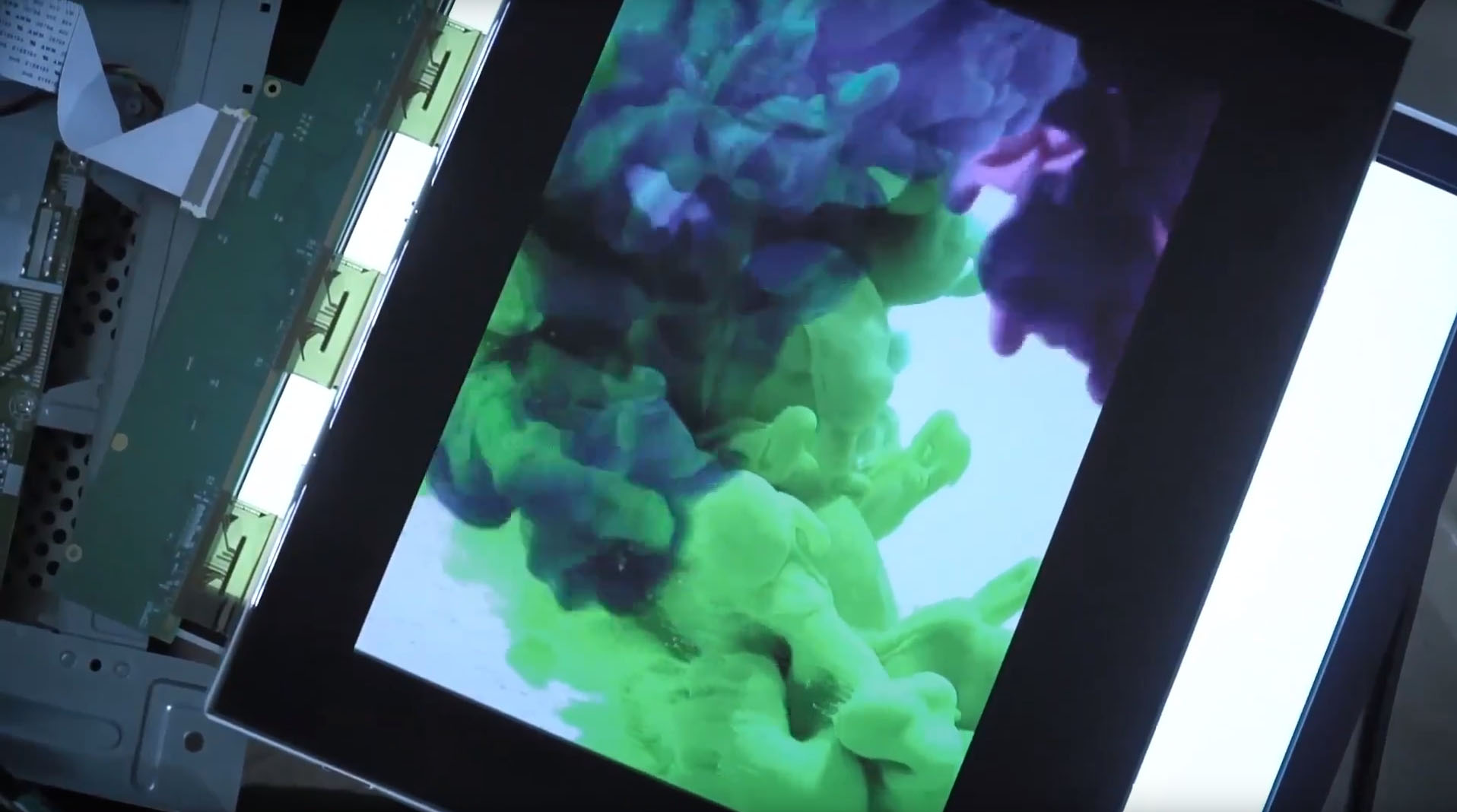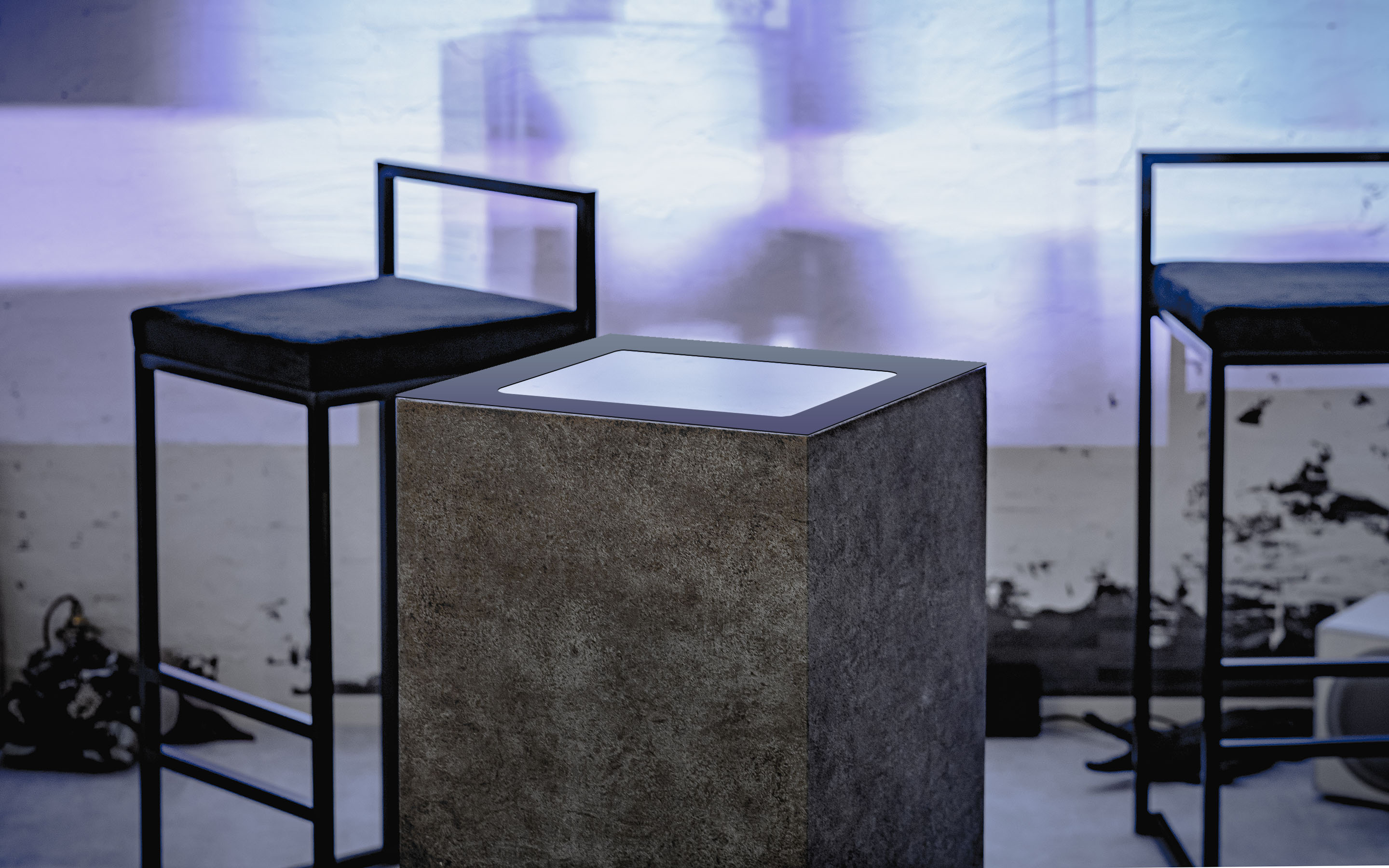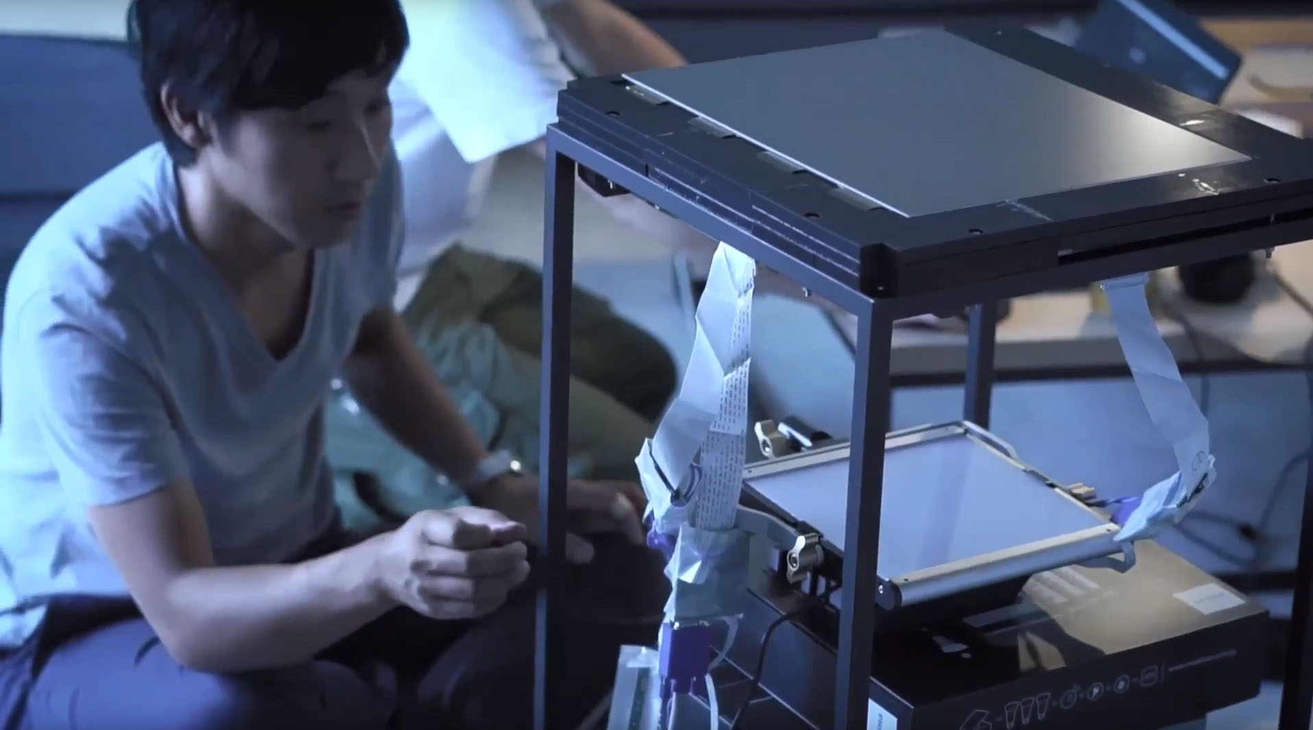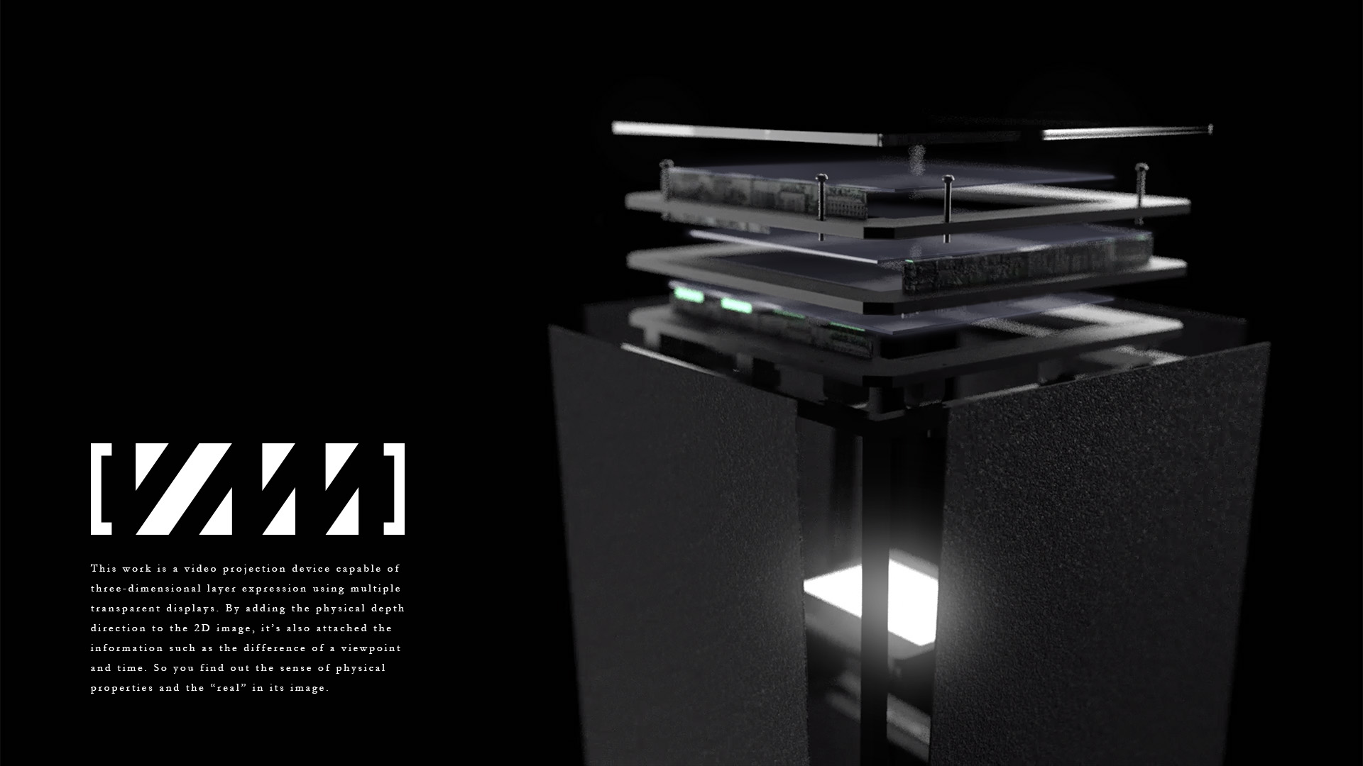 本作品 [Zi?] は、複数枚の透過ディスプレイを利用した、立体的なレイヤー表現が可能な映像投影デバイスです。物理的な奥行き方向を付加し、鑑賞者の視点や、時間軸等の情報を付加した映像を投影することにより、2次元とも3次元とも異なる新たな映像表現を可能にします。