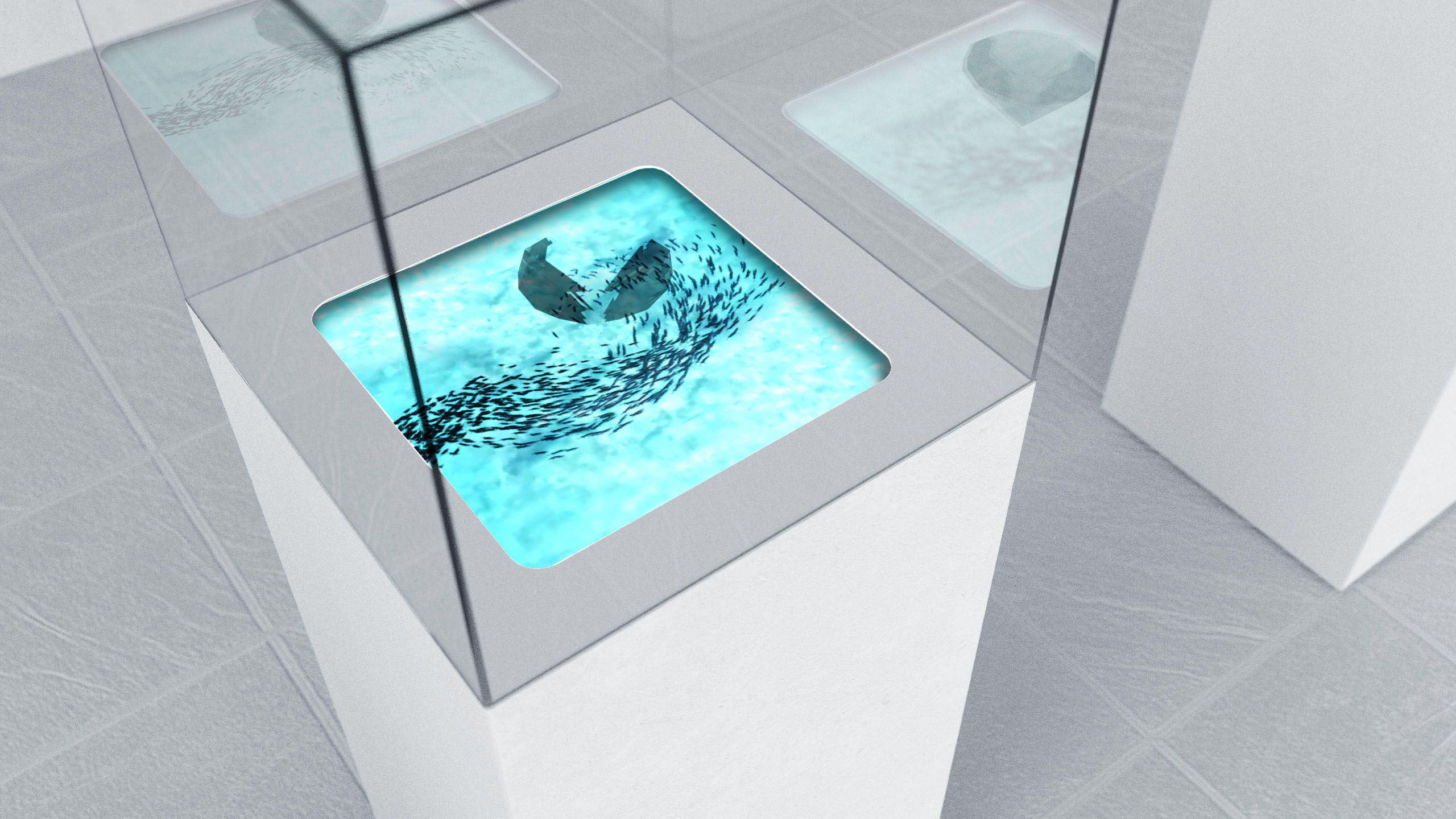 本年行ったプロトタイプ展示では、複数の黒い図形が生き物のようにレイヤー間をランダムに行き来するような表現や、海面の船、海中の魚群、海底のテクスチャに分離した海の表現、シアン・マゼンタ・イエローで生成した幾何学模様により錯視を引き起こすような表現などの映像作品を本作と共に出展しました。