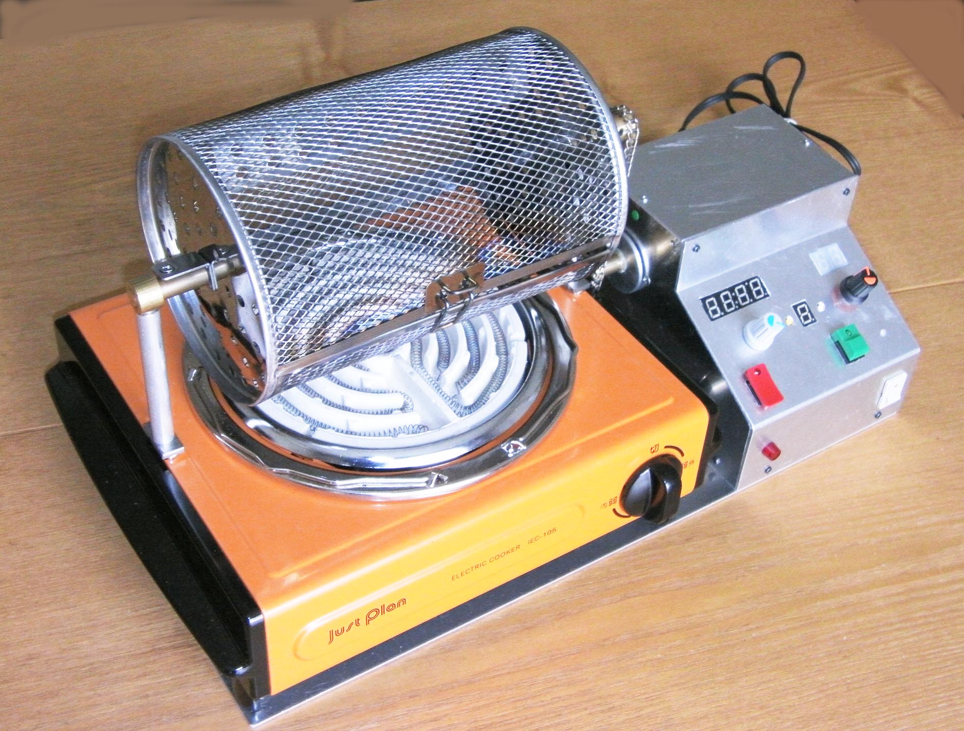 生豆を入れるドラムをギアードモーターで回転させています。回転のスピード、回転方向を自由に設定できます。また、タイマーが付いていますので、好みの焙煎時間を任意に設定することができます。ドラムの回転方向も、例えば、3回正転させて逆転させるを繰り返すなどの、細かい設定も可能です。タイマーで設定した時間でヒーターの回転は自動的に停止し,さらにドラムは設定した時間回転を続け、豆を冷却します。