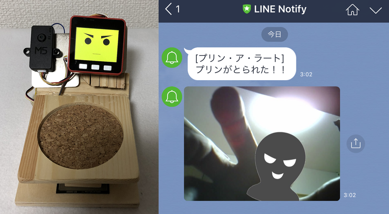 プリン・ア・ラートは、プリンが取られたことを検出すると、犯人に警告を与えます。怒った顔、「プリン、返してね」という強いメッセージ。ついついとってしまった、その人のこころに罪悪感を与えます。プリンは多くの場合、もとの場所に戻されるでしょう。