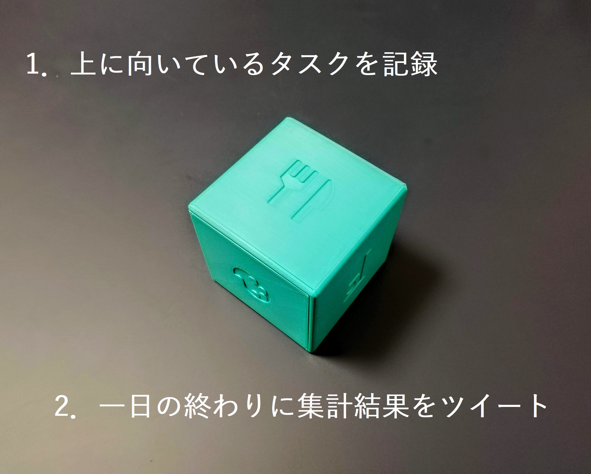 1.立方体の各面には6種のタスク(仕事、食事、休憩、睡眠、勉強、アート)がアイコンで割り振られている