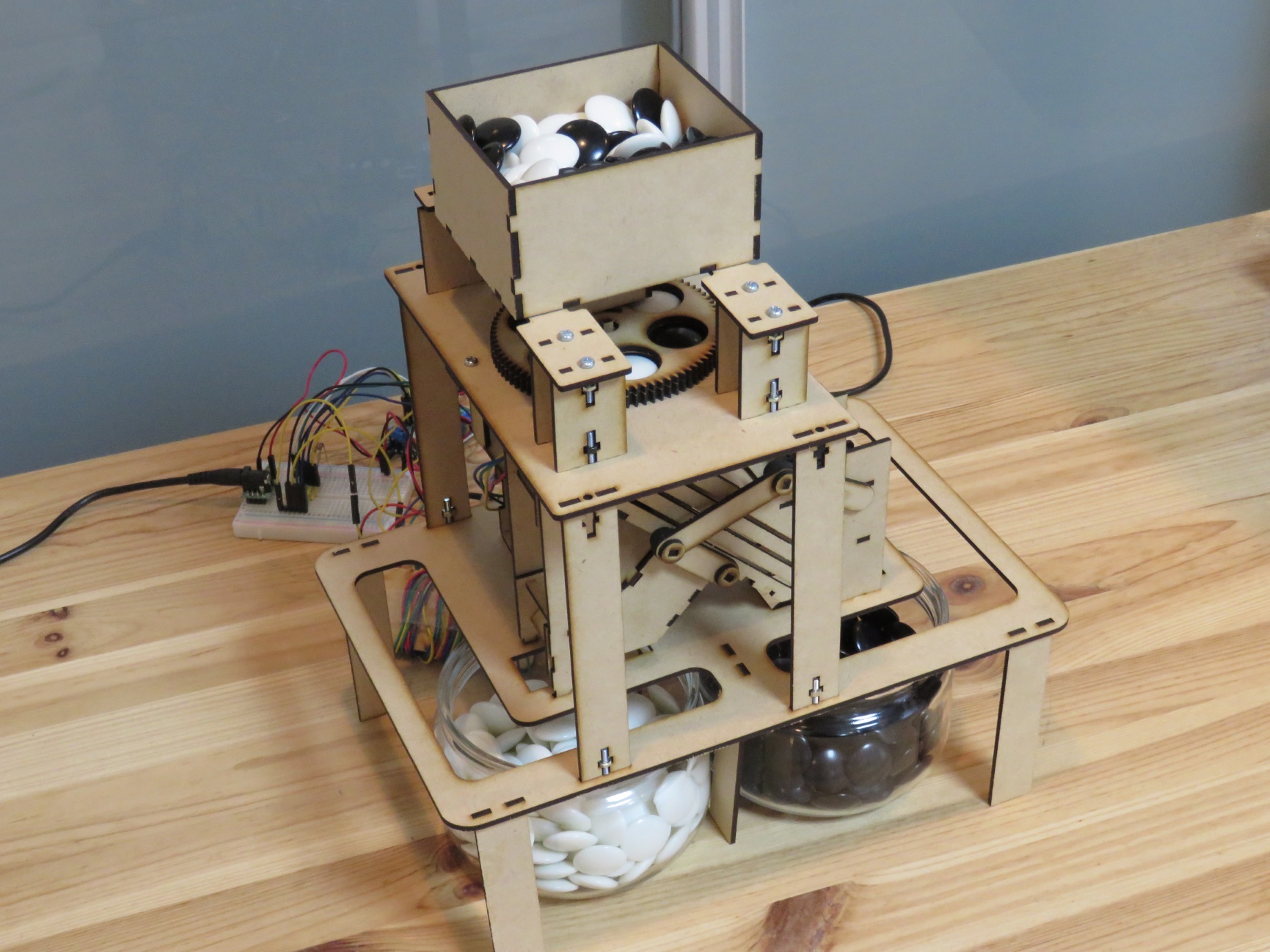 白黒混ざった状態の碁石を投入すると、自動で色を判別して仕分けしてくれる装置です。