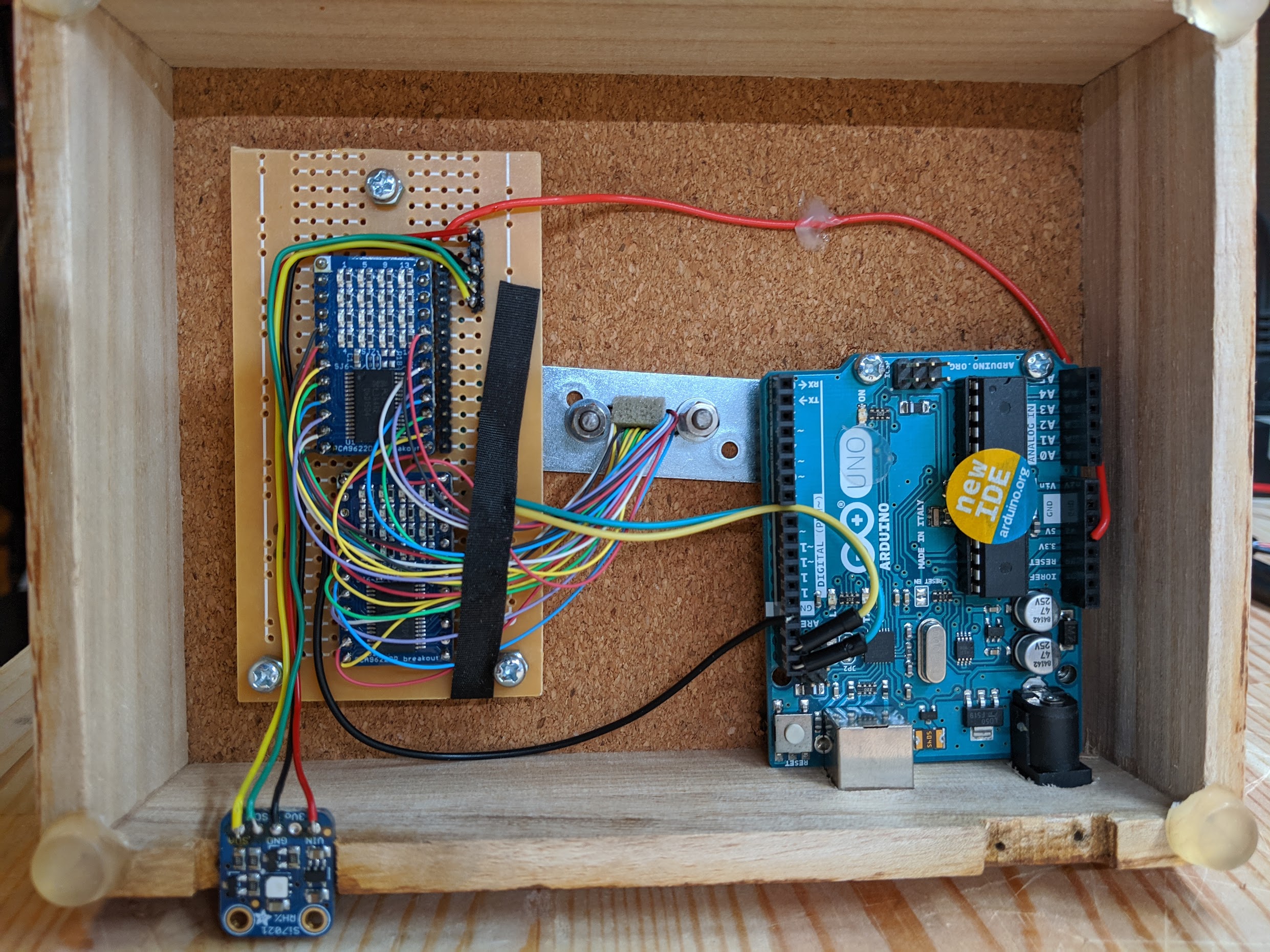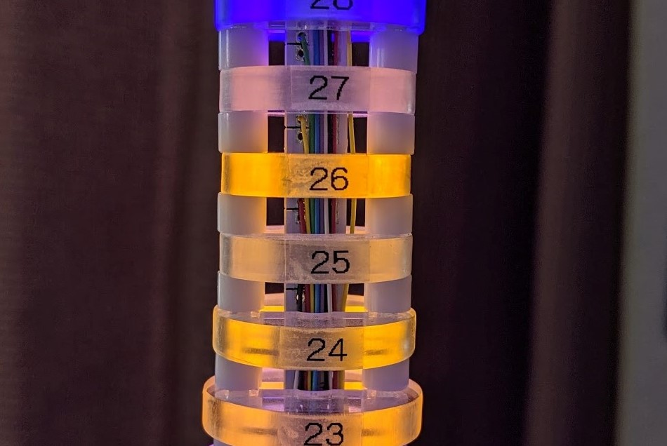 円盤プレートの中央から一方向にLEDを照射していますが、できるだけプレートの端面全体が光るように裏側(温度の書いていない方)に照射しテープに反射させています。