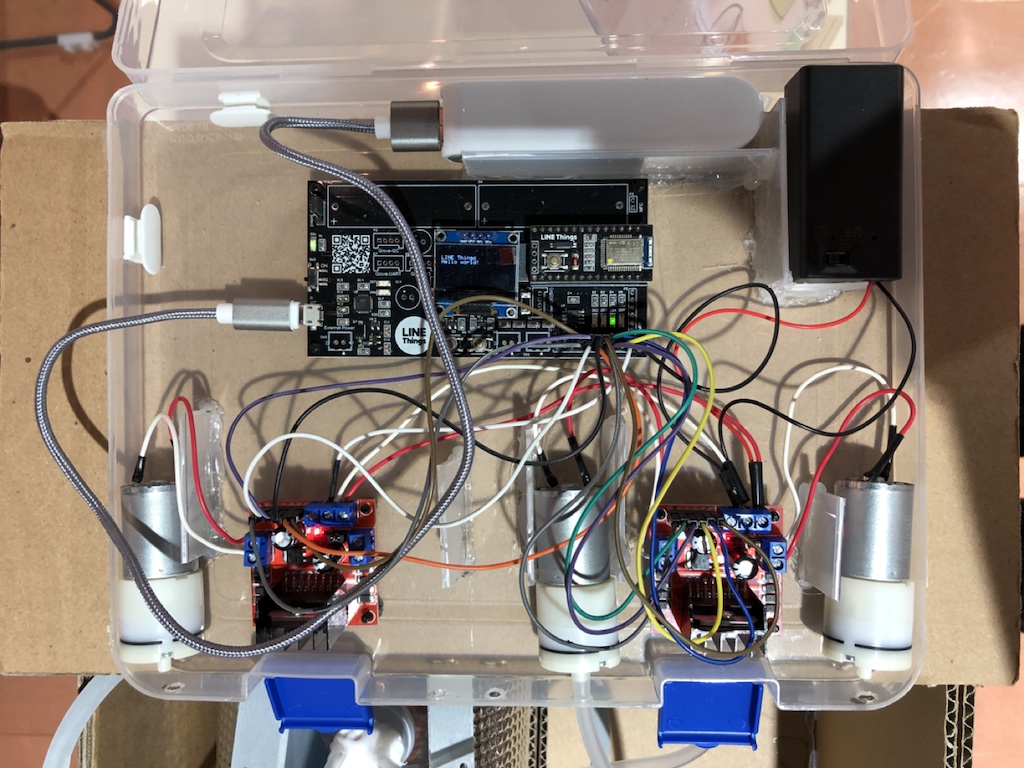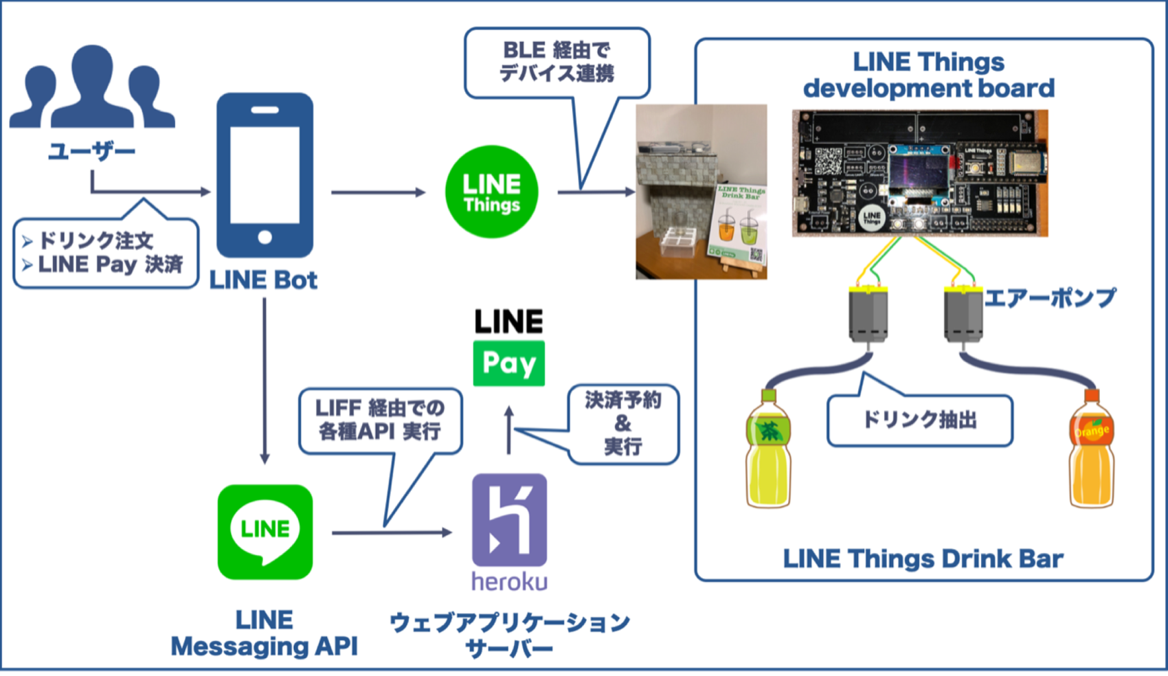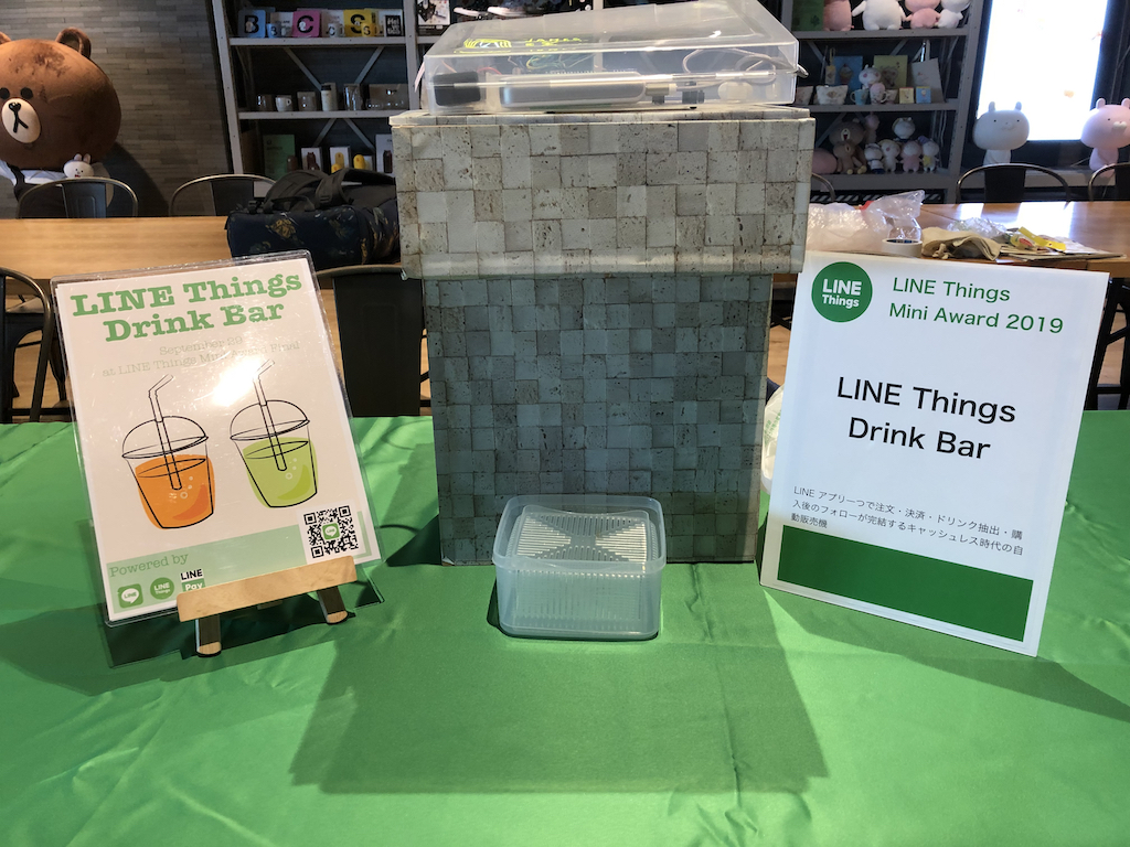 「LINE?Things?Drink?Bar」は、LINE?Pay?での決済機能と、LINE?アプリからハードウェアを操作できるIoT?プラットフォームであるLINE?Things?に対応したジュースの自動販売機のプロトタイプです。いわゆるカップ式自動販売機のプロトタイプ実装です。
