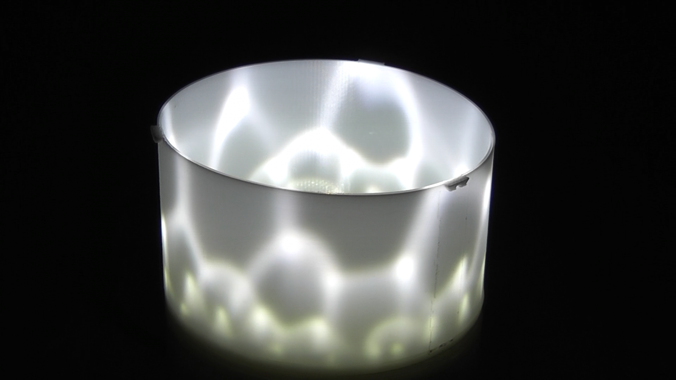 ファラデー波とは液体を振動で共鳴させた際に液面に現れる流体現象のことであり、サイマティクスとも呼ばれています。この現象を利用することにより海辺で見られる光の波紋が描く幻想的な光景を室内で楽しむことができます。
