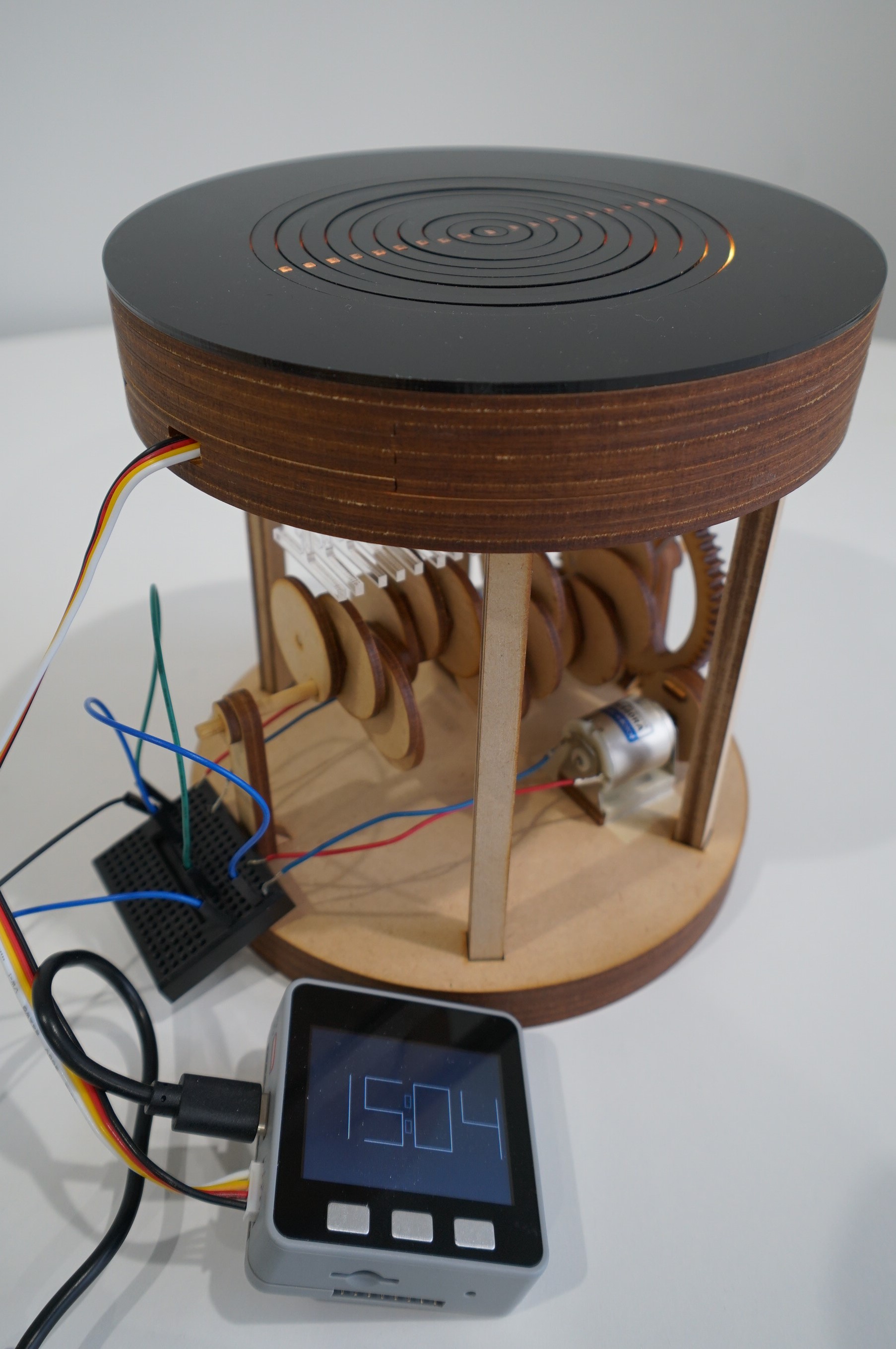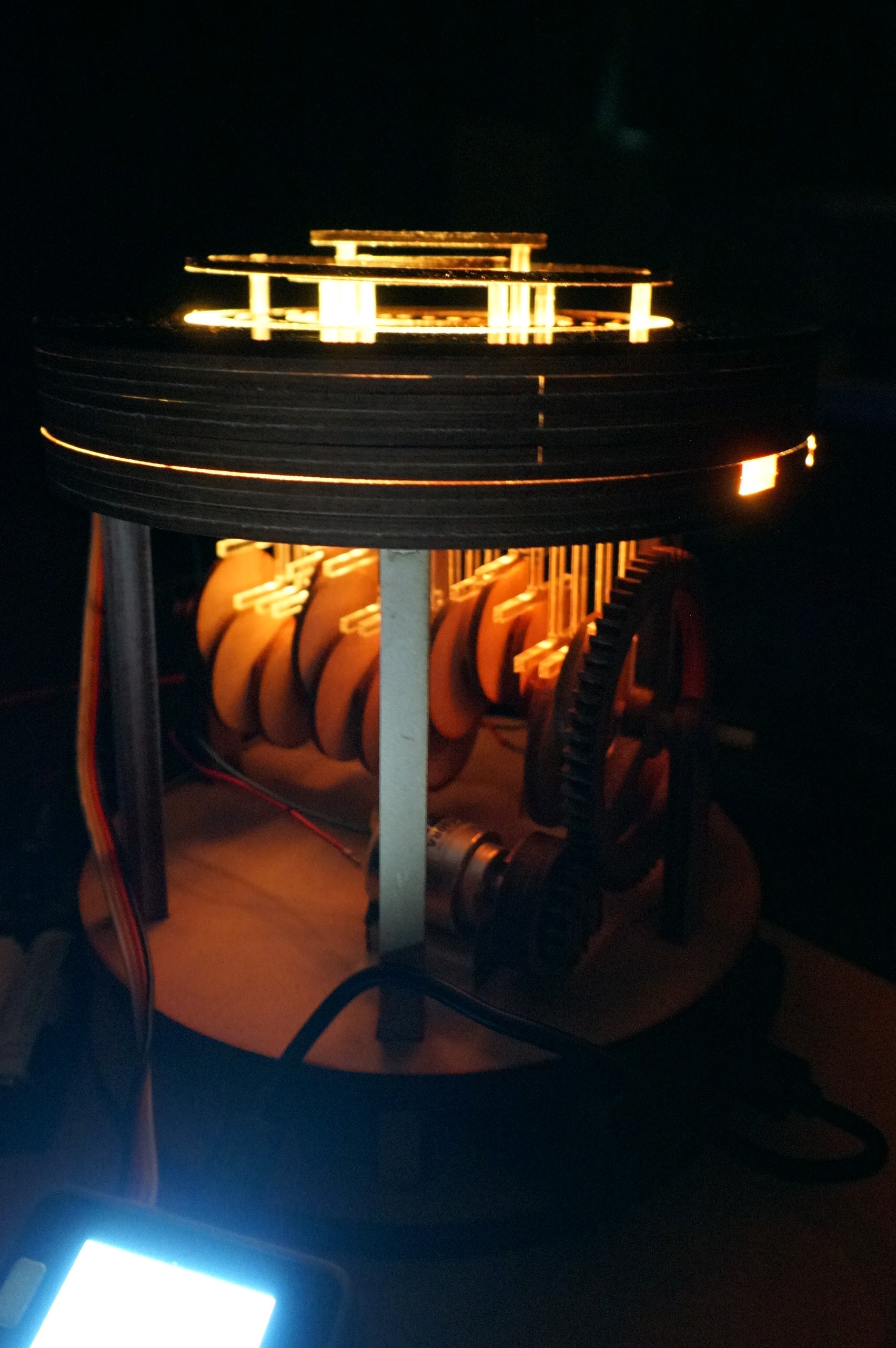動くオブジェクトであるkinetic artに光を下から当てることで、燃えさかる炎を表現した照明です。カムの回転軸の高さを変えることで、オブジェクトの高さを変えることができ、見る者の目を飽きさせません。