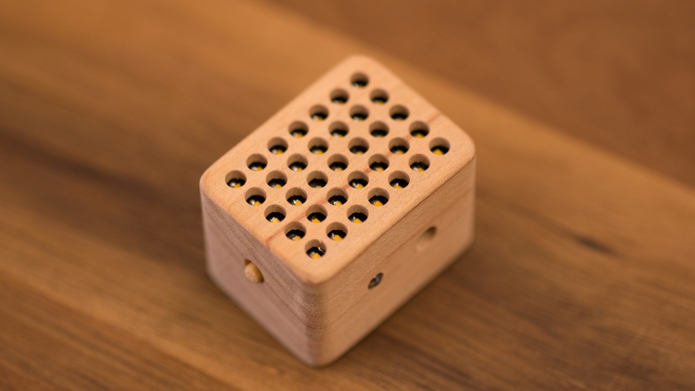 ケースは、荒廃した山林の施業を応援するため、国産材(ヤマザクラ)をCNC加工したものを使用。将来的には、英単語学習や、時計機能も付加も視野。
