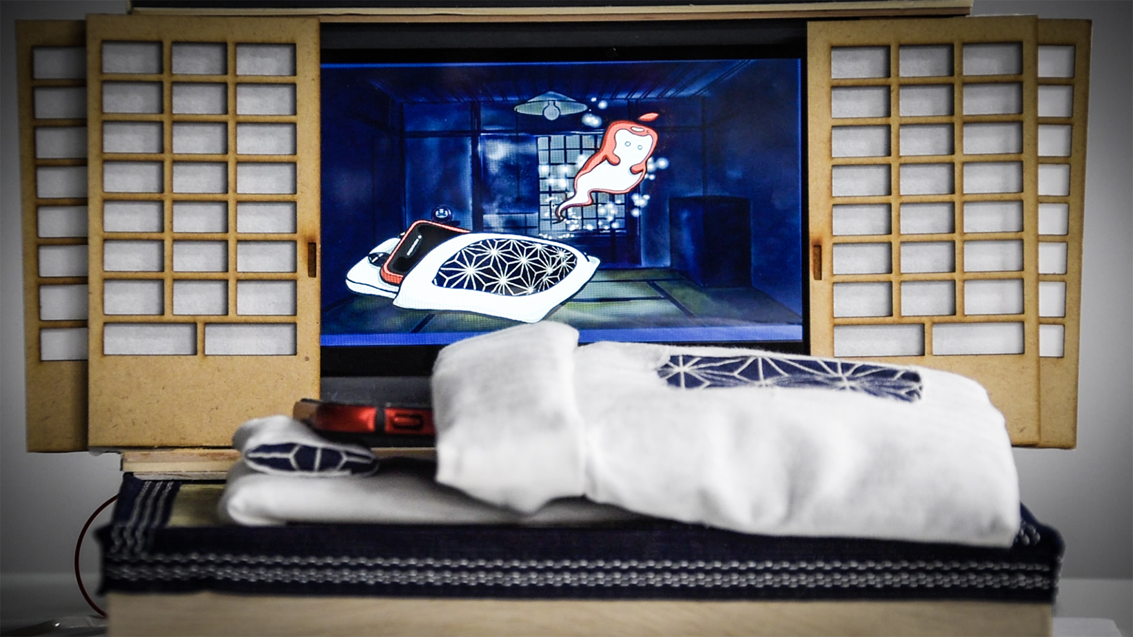 皆さん夜寝る前にスマートフォンをいじってたらなかなか眠れず夜更かしをしてしまった、いつもダラダラと寝る前にSNSを見てしまう、そうした結果翌朝後悔したこんな経験はありませんか?私たちの作品「スマホもおふとん」はそんな人達へスマホもおふとんに入ってもらうことで夜寝る準備ができたらスマホをいじらずに寝てもらおうそういった願いを込めて作成された作品です。