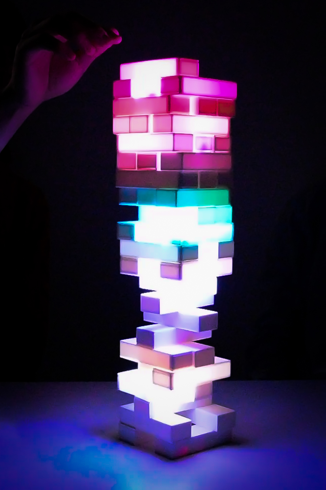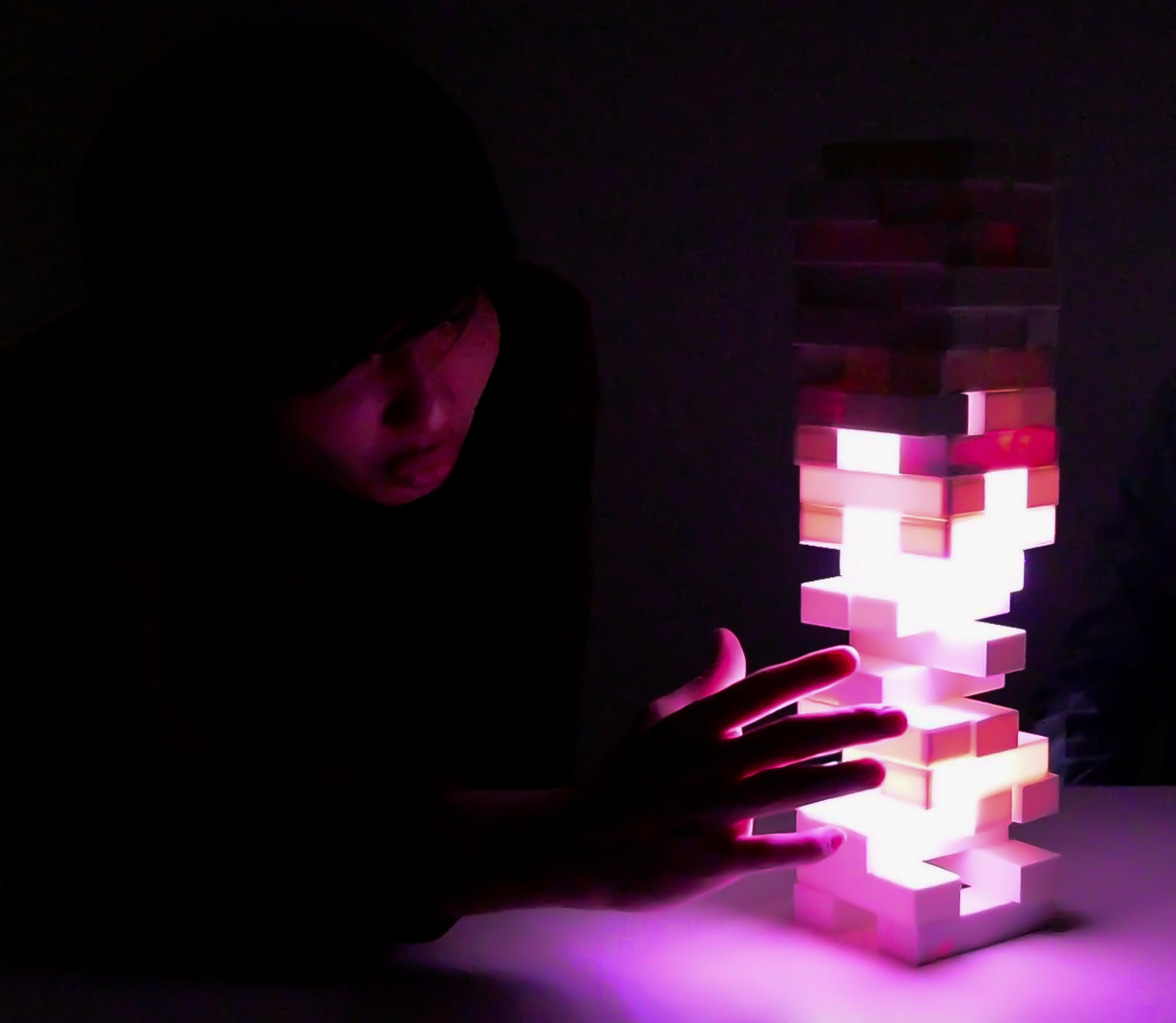 ジェンガを遊ぶ上で、視覚と触覚はジェンガのキモであることに着目し、製作した作品。暗闇によってジェンガが見えず、本来のスリルをさらに引き立て、プレイヤーが触れたり、ジェンガが揺れたりすることで光り、ゲームのシーンによって不安や安心を感じさせるインタラクティブジェンガ