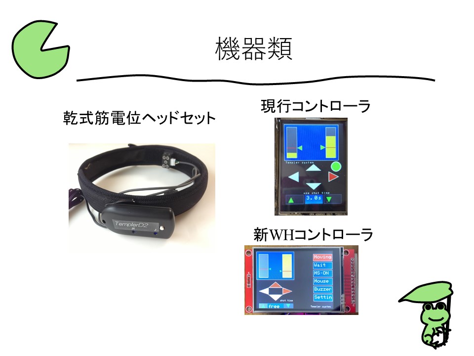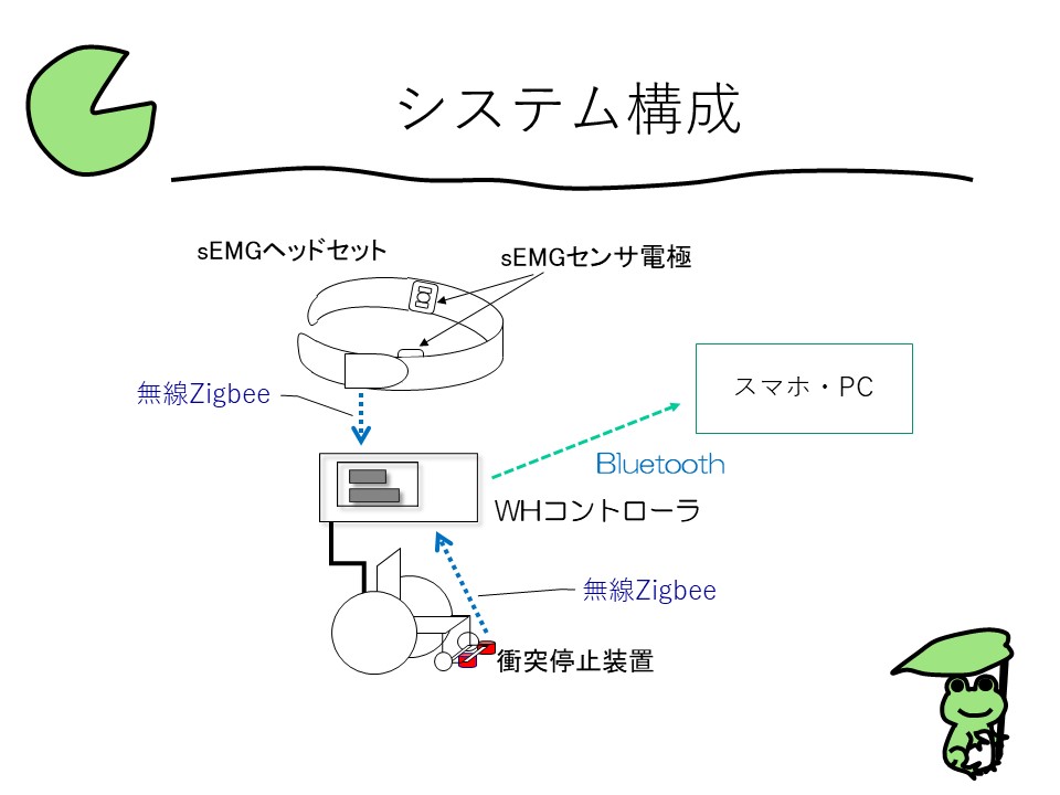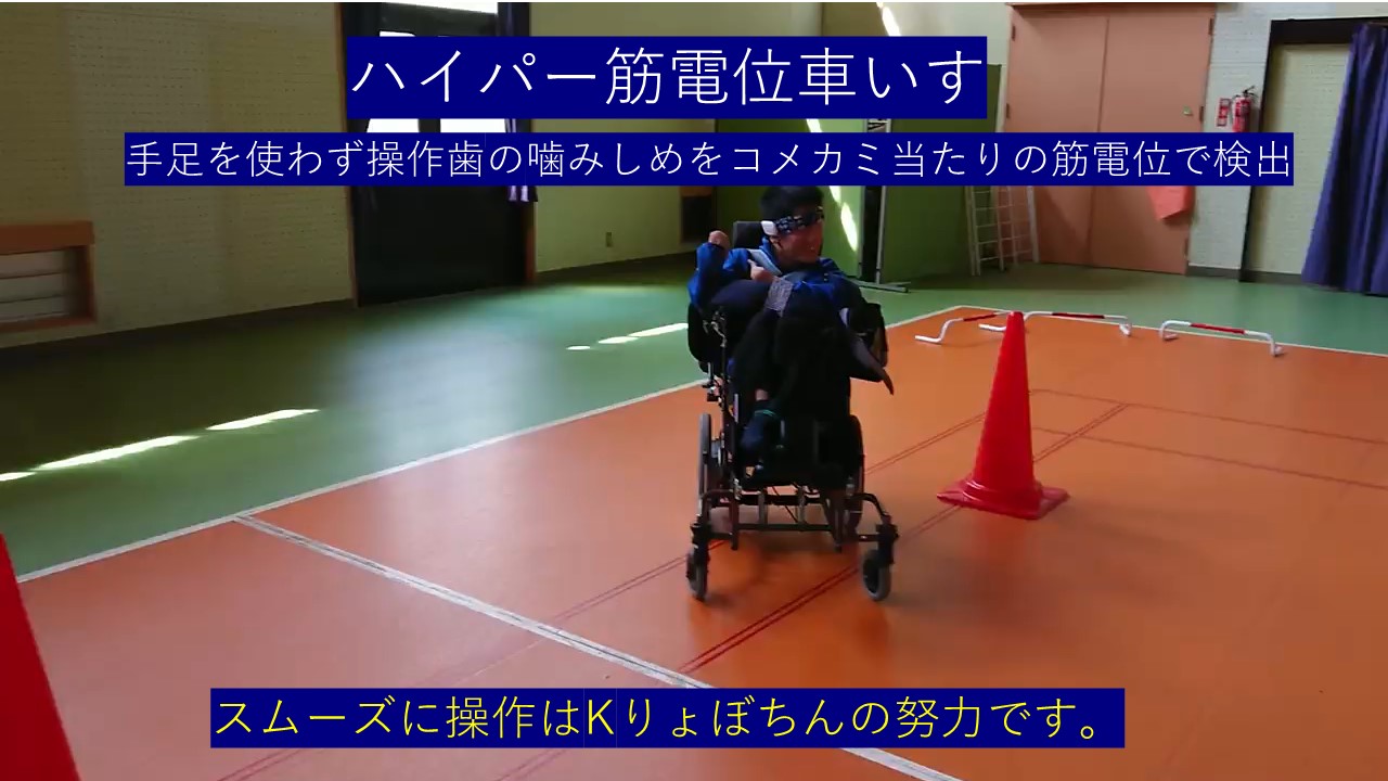 重度の脳性まひ児童(Kりょぼちん)の宿題を自分でしたいとの要望から歯を噛みしめるときに発生する筋電位により操作する筋電位マウスを開発し、Kりょぼちんの自分で動きたいとの要望でこのたび障がい者ように筋電位電動車いすのインターフェイスシステムを開発しました。